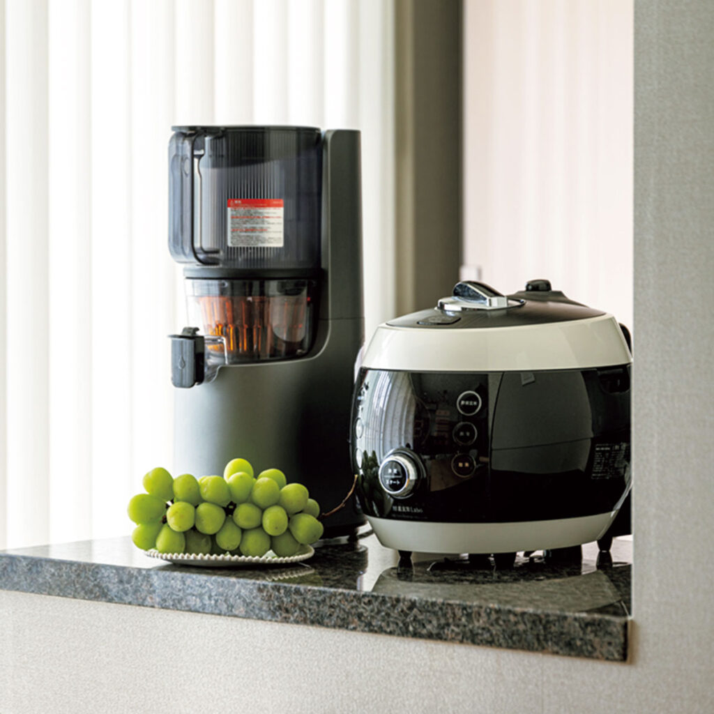 キッチンで活躍してくれる調理家電は、酵素玄米が炊ける「Labo」の炊飯器やコールドプレスジュースを楽しめる「HUROM」スロージューサーという青さんらしいこだわりのセレクト。