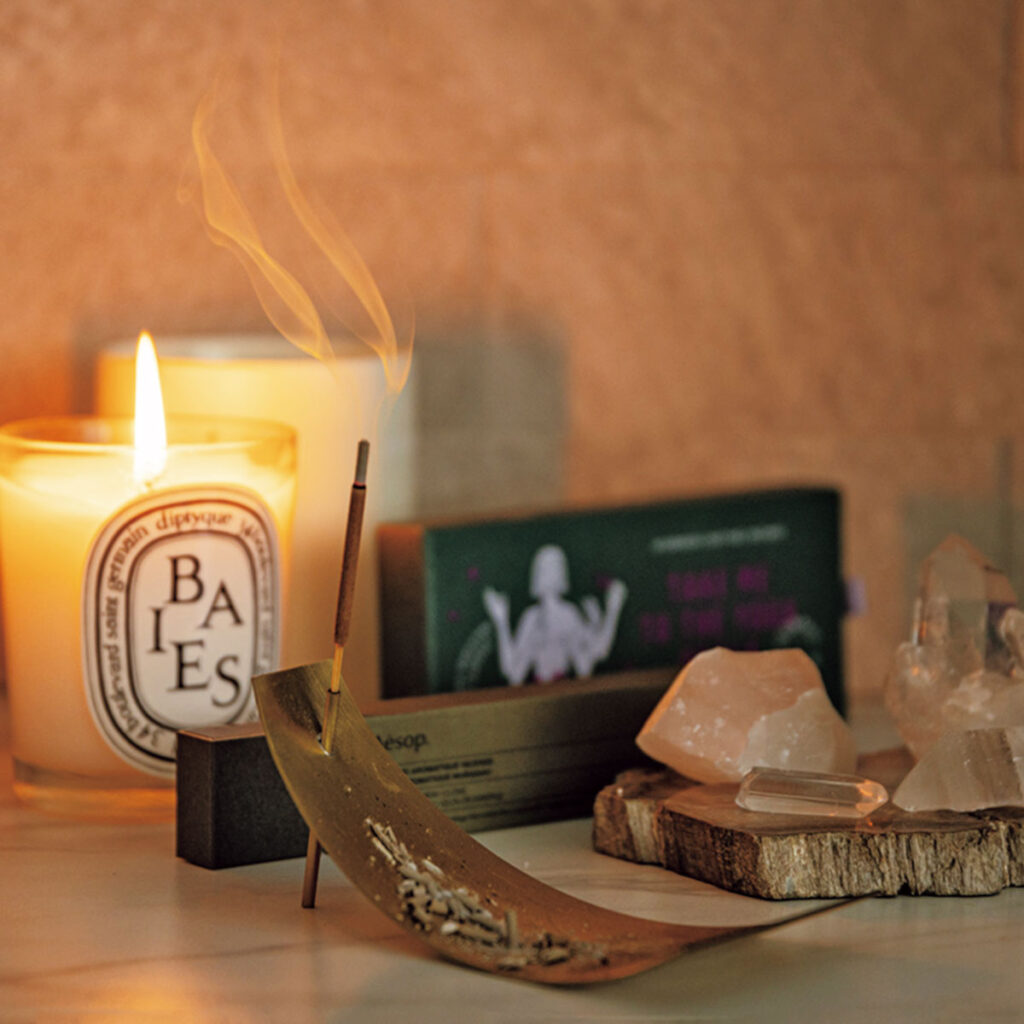 リフレッシュまたはリラックスさせてくれる香りを日常的に取り入れている。「APFR」や「イソップ」のお香、「ディプティック」のキャンドルなどのフレグランスアイテムはリビングのワンコーナーにまとめて。