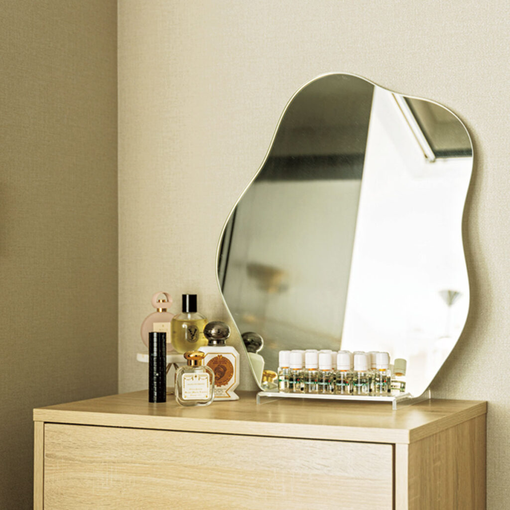 出かける直前の最終チェックをする鏡の前には、お気に入りの香水をディスプレイ。さらに飲み忘れ防止のために、疲れたときに頼れるビタミンB「Vitabaum」を置いて。