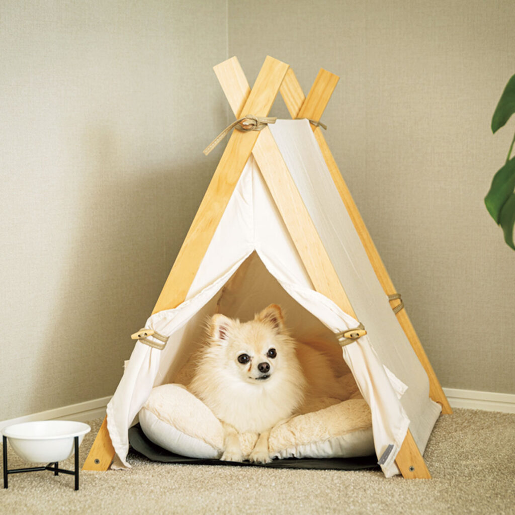 リビングとの間仕切り戸を外した洋室には、家族の一員であるエニちゃんのコーナーをつくっている。小さなテントハウスがキュート!