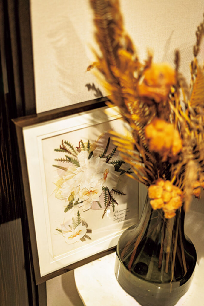 さりげなく飾られているのは、ウェディングブーケを押し花にしたパネルや前撮りで使用したドライフラワー。結婚式の思い出を形あるものにして残している。