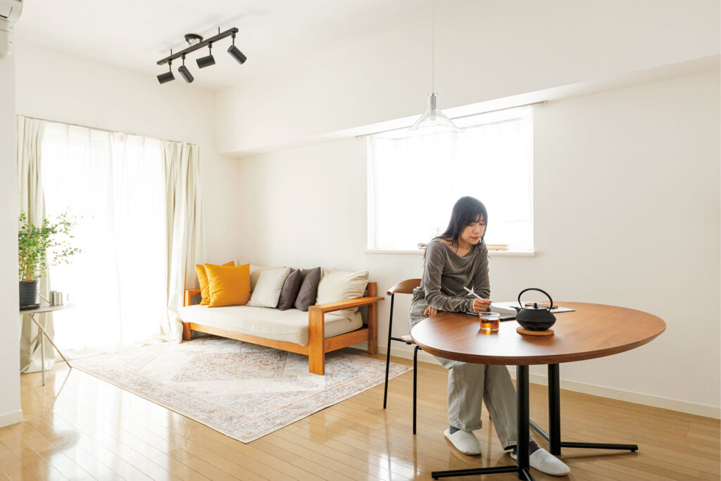 さらにインテリアで心掛けたポイントは、「来てくれた友人たちが寛げるように」。四角いテーブルは座れる人数が限られますが、このダイニングテーブルは天板が卵形かつ脚が中央にあるので、人数に合わせて椅子を増やすことができ、皆で食卓を囲めます。