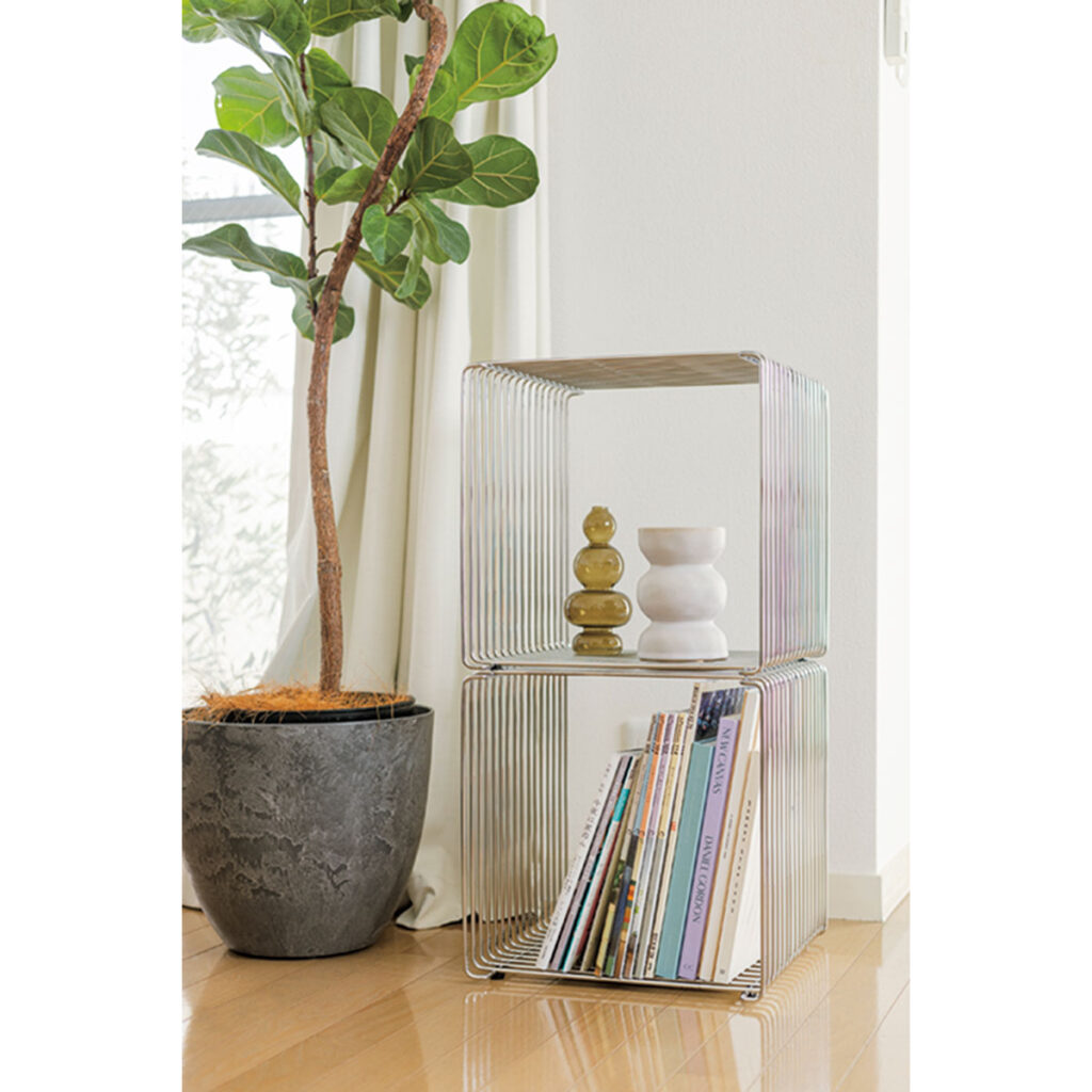 「木をメインにした空間に金属を入れたくなって」と、買い足したのはデンマークの家具メーカー「Montana」のワイヤーシェルフ。「花を生けるよりデザインに惹かれて、つい増えてしまう」という花器のディスプレイ、本や雑誌の収納に。