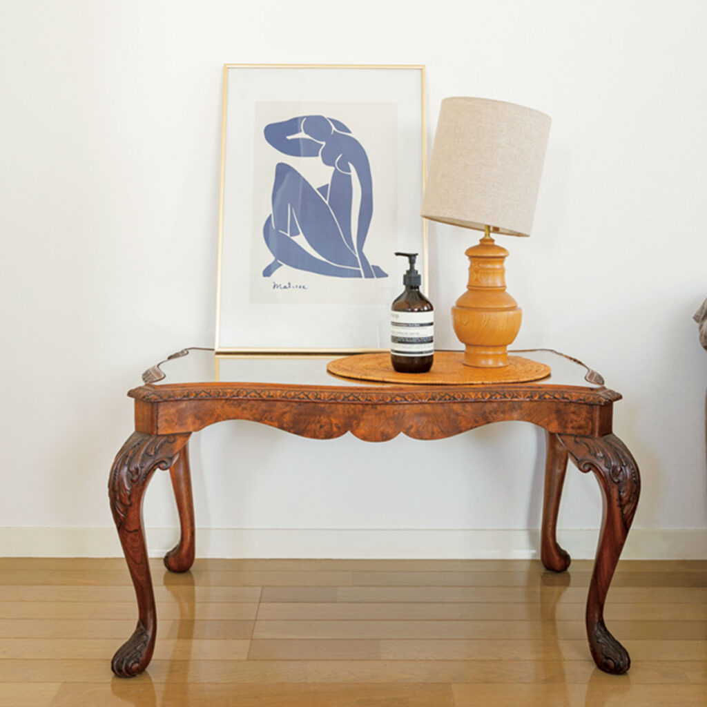 実家から譲り受けたサイドテーブルは「ロイズ・アンティークス」のもの。テーブルランプとハンドクリーム、そして一番好きなアーティストだというアンリ・マティスのパネルを飾ってベッドサイドに。