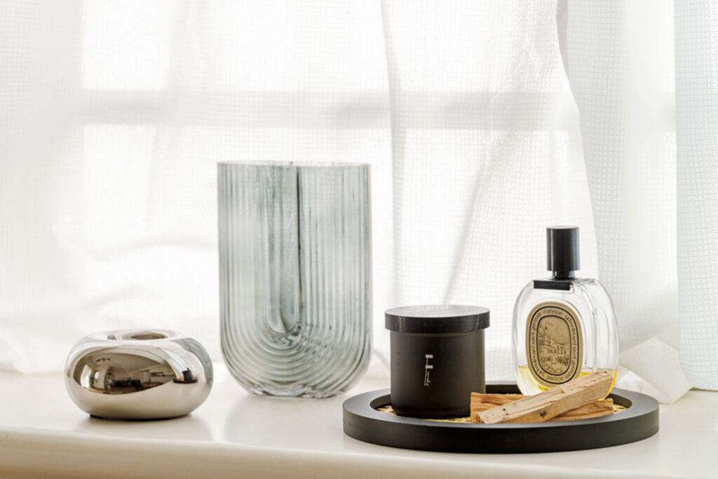 リビングの出窓はパロサントやキャンドルがあるコーナー。ウォークインクローゼットにはディフューザー、玄関にはポプリを置き、空間ごとに香りを変えて気分を切り替えるようにしている。