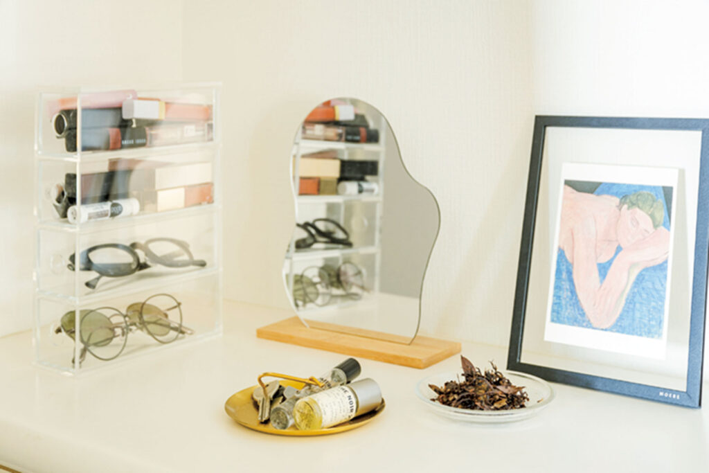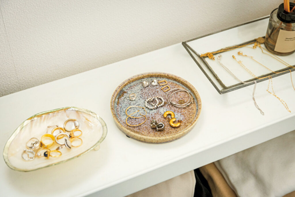 アクセサリーはしまい込まず、リング・ピアス・ネックレスなどのアイテム別に皿やトレイに入れて。手に取りやすく、整理も簡単。
