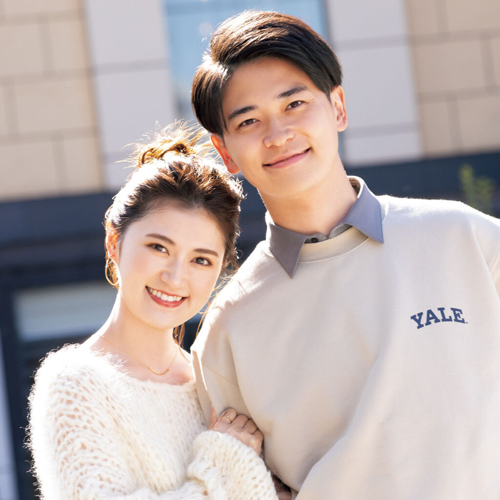 前職の先輩、後輩として出会う。大地さんの猛アプローチの末交際をスタートし、1年記念日にプロポーズ。来年2月にパレスホテル東京にて挙式予定。休日の楽しみは二人でフェスにも足を運ぶほど大好きな日本酒を嗜むこと。