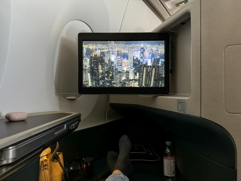 行きは朝だったので寝てしまいましたが、帰りは機内エンタテインメントを満喫。香港から羽田までは5時間ほどのフライトなので、映画を見ていたらあっという間に到着しました。