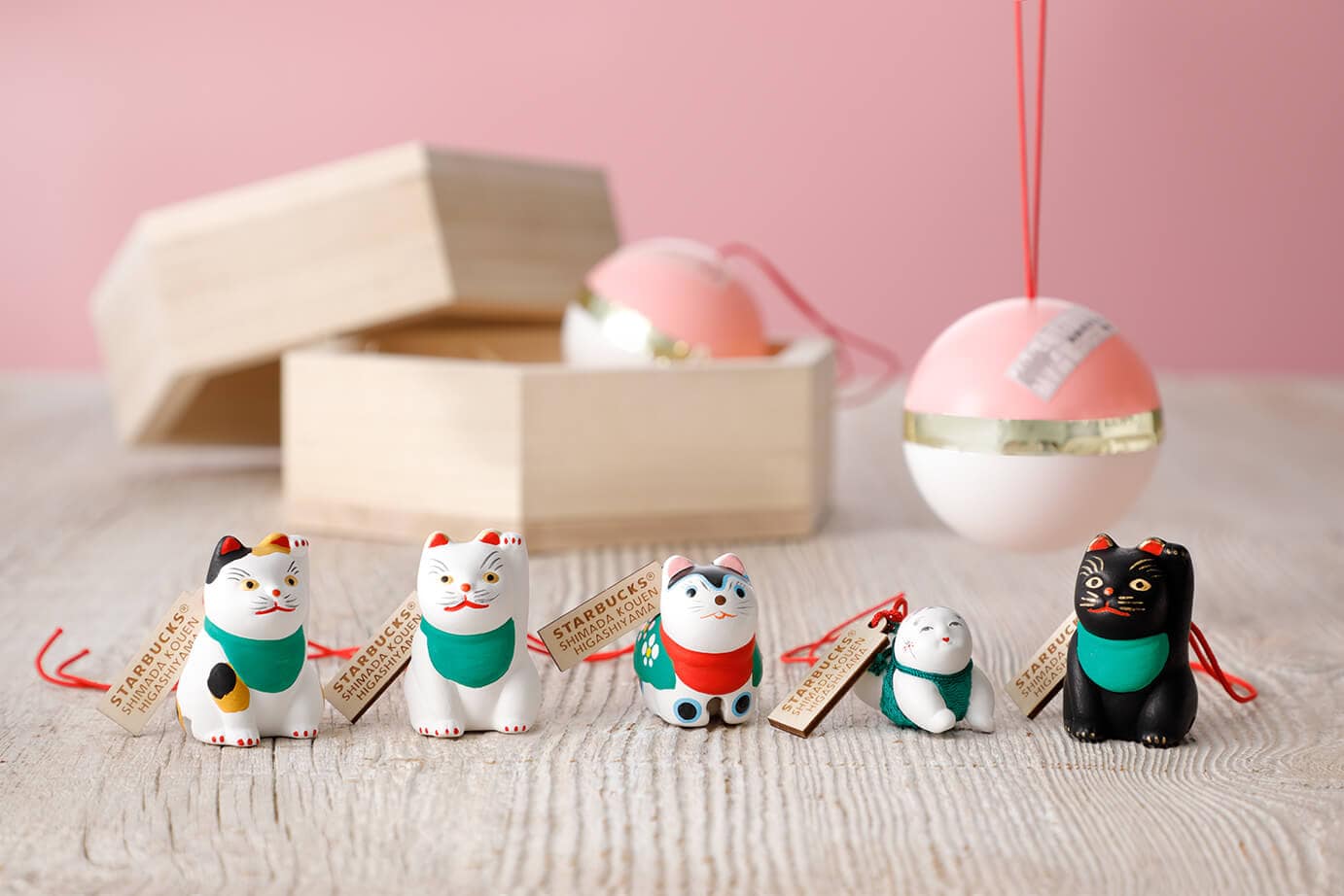 安政六年(1859年)に京都で創業し、御所人形の老舗として日本の伝統的人形を創りつづけている「島田耕園人形工房」と共同で開発。京都・祇園の風物詩として今も大切にされている福玉から発想を得て、伝統ある御所人形と組み合わせた、JIMOTO made Series初となる、「縁起物チャーム」が誕生しました。福玉とは、紅白でできた丸い玉に縁起物を入れ、年の終わりに芸舞妓らがお茶屋やなじみの客から、その年のねぎらいやお年玉として頂く、伝統的なもの。大晦日の除夜の鐘が鳴り終わった後、この福玉を開けて中身で新年の運気を占う風習もあったと言われています。今回のJIMOTO made Series HIGASHIYAMA 「縁起物チャーム」は、この福玉からインスピレーションを受けて、「御所人形チャーム」の這児(ハイコ)、「縁起物チャーム」の駒犬土鈴、招き猫土鈴のクロ、シロ、ミケを1点ずつオリジナルの福玉カプセルにこめられました。そして、このカプセルを開けるまでどの「縁起物チャーム」が入っているかわからない、まさに運だめしのような遊び心のある商品です。この福玉カプセルに入っている縁起物は、全部で5種類ありますが、店舗により取り扱う縁起物が異なります。這児(ハイコ)と駒犬土鈴は3店舗で展開し、店舗ごとに異なる縁起物として、スターバックス コーヒー 京都二寧坂ヤサカ茶屋店は招き猫土鈴クロ、京都祇園ホテル店は招き猫土鈴ミケ、京阪祇園四条駅店が招き猫土鈴シロとなります。さらに福玉カプセルには店舗ごとに異なるデザインの千社札のステッカーを貼り、スターバックスならではの福玉に仕上がっています。