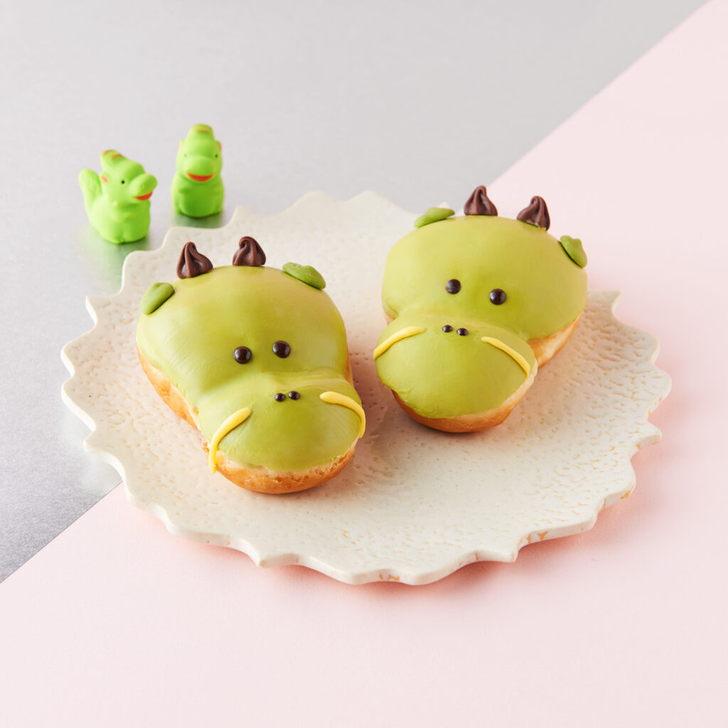 愛嬌たっぷりの辰モチーフのドーナツは、ふわふわのイースト生地をミルキーな味わいのグリーンカラーでコーティングし、耳には抹茶チョコレート、角にはスイートチョコレート、髭にはプリン風味のチョコを使用。中には、コク深いカスタードクリームが入っています。販売期間は1月17日まで。