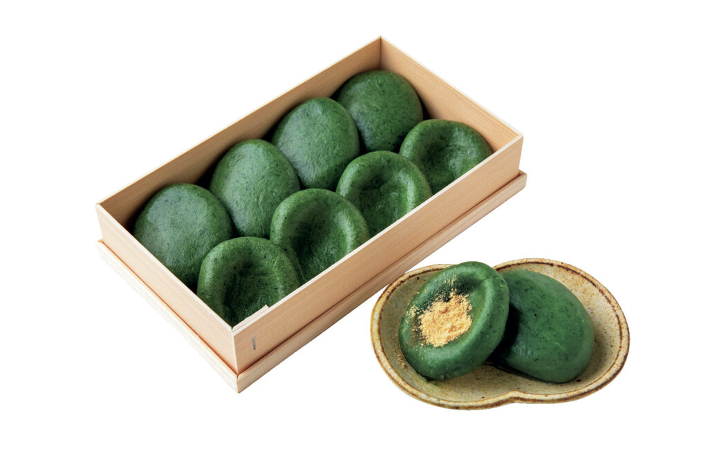 明治2年に創業、隅田川を渡る舟客が足を休める茶屋として始まった「志゛満ん草餅」。店名が掲げるとおり、こちらの名物は艶やかな深緑色の草餅です。手作業でよもぎの粗い繊維を取り除き、上新粉の餅生地につき込んでいます。真ん中にくぼみがある「あんなし」はもっちり柔らかな口当たりに、よもぎの香り高さが際立ちます。お好みできな粉と白みつをかけてどうぞ。ふっくら丸い小判形の「あん入り」は、爽やかなよもぎとコクあるこし餡がバランスのよい味わいに。