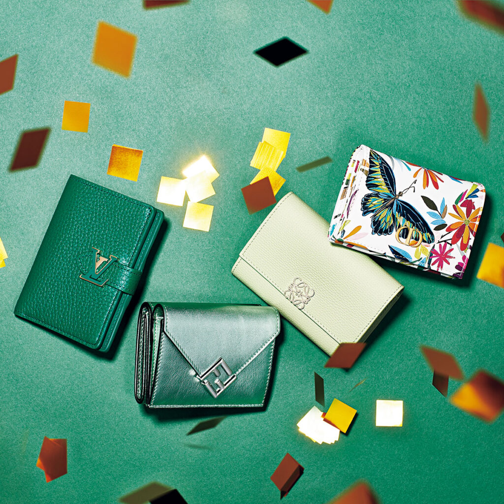 [右から]【DIOR】財布[H7.5×W11×D2.5㎝]¥76,000(ディオール/クリスチャン ディオール)【LOEWE】財布[H8.2×W11.8×D3㎝]¥93,500(ロエベ/ロエベ ジャパン クライアントサービス)【FENDI】財布[H8×W10×D4㎝]¥77,000(フェンディ/フェンディ ジャパン)【LOUIS VUITTON】財布[H12×W9×D1㎝]¥134,200(ルイ・ヴィトン/ルイ・ヴィトン クライアント サービス)