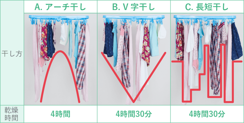「夜洗濯」の場合は、リビングなど暖房をかけている部屋に干すのが正解。室温が高い部屋に干すことで、乾燥スピードが上がるので、部屋干し臭の発生も抑制できます。「アーチ干し」など効率的に乾かせる干し方も実践しましょう。