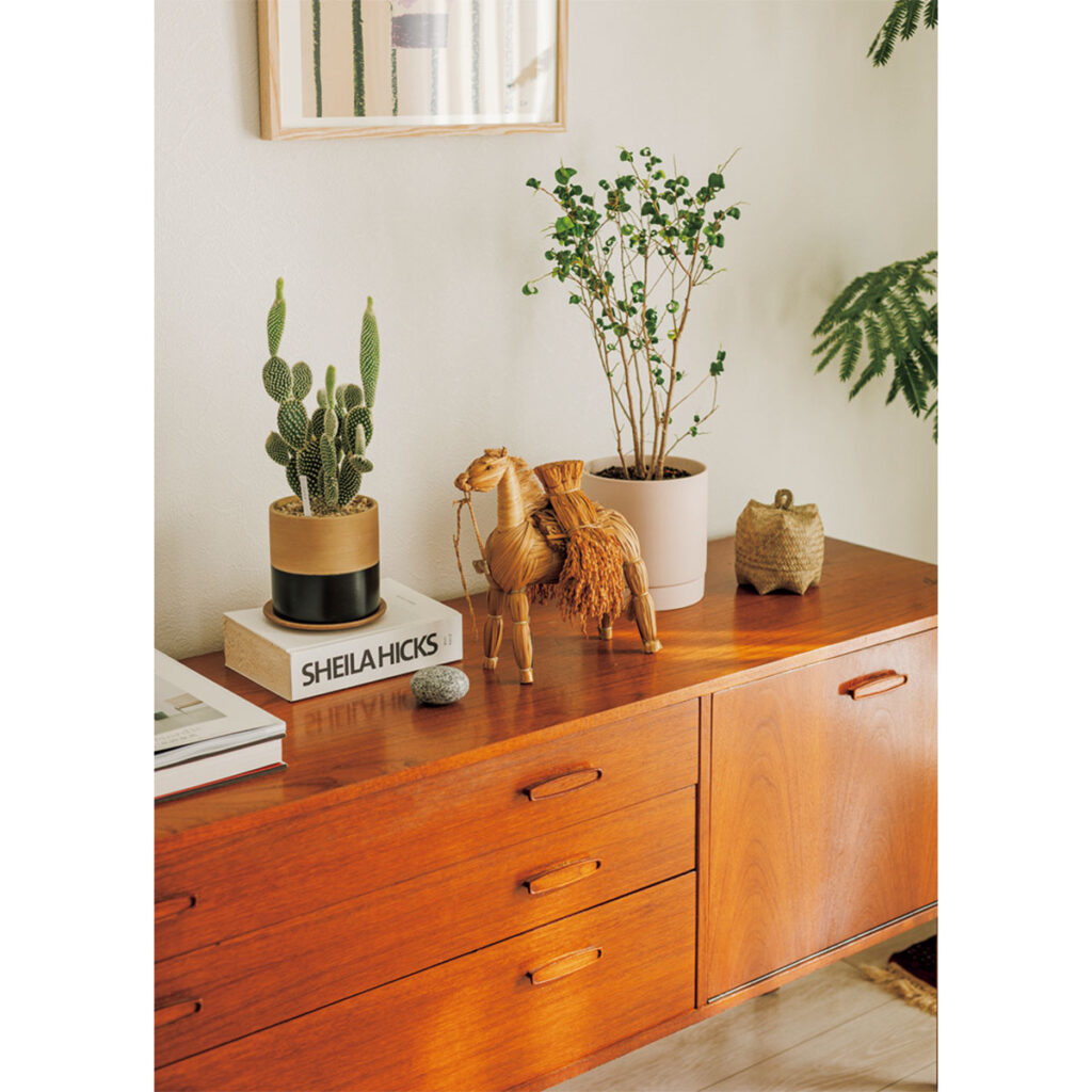 メインフロアで最も目に留まるコーナーに配置したアンティークのサイドボードには、お気に入りのアイテムや季節感のある雑貨をディスプレイ。「背負った稲穂が縁起が良さそうで」と飾られた「わら馬」は、二人の干支モチーフでもある。