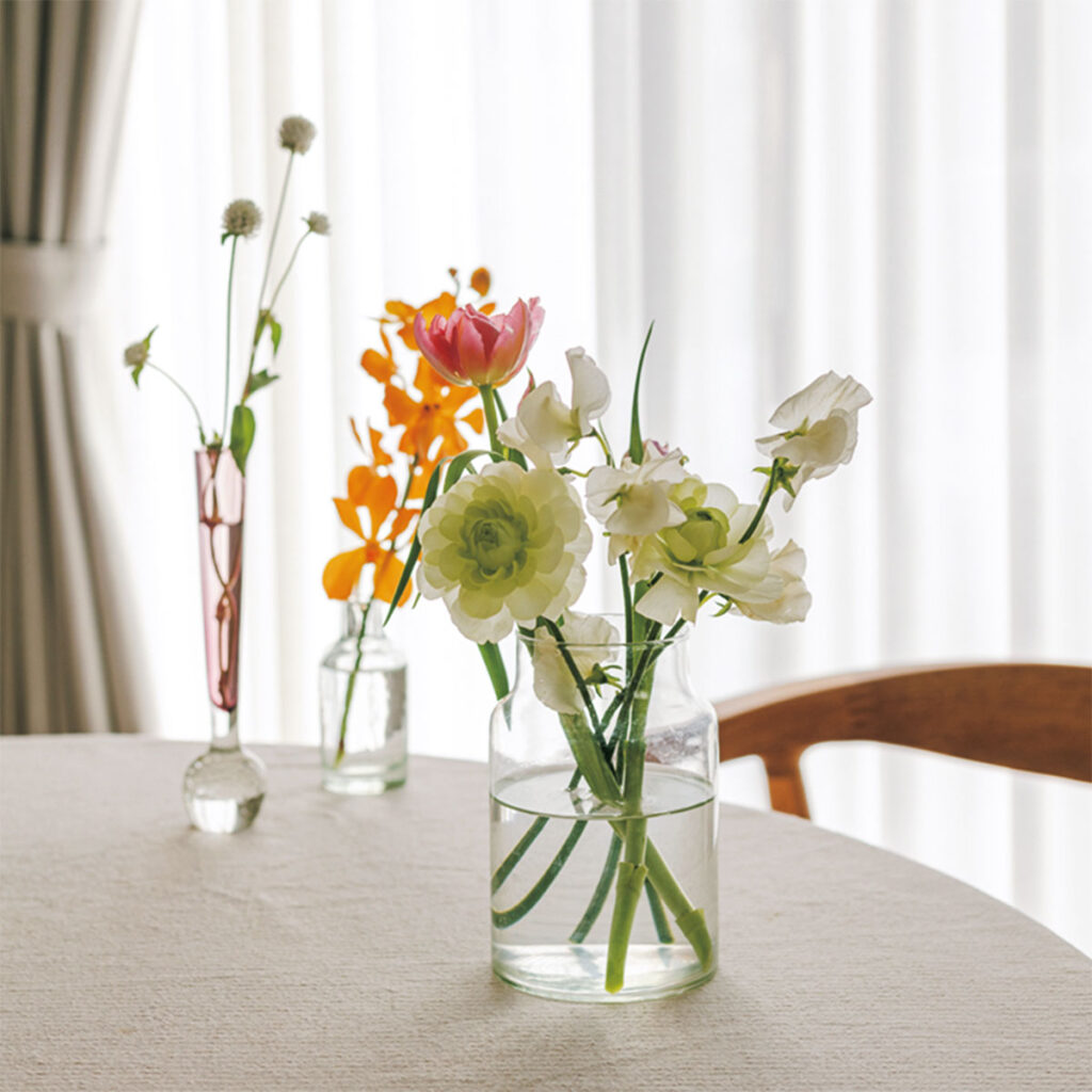 ダイニングテーブル、キッチンカウンター、ソファのサイドテーブルと、部屋の所々に花を生けて。「気持ちが明るく元気になるので、生活にお花は欠かせません」