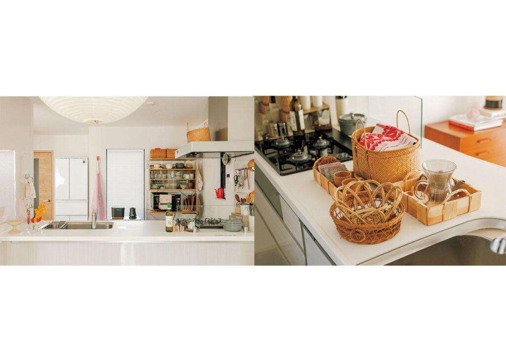 キッチンの小物類はアイテムごとに分けて籠に収納。使うときに取り出しやすく、インテリアにも馴染む。