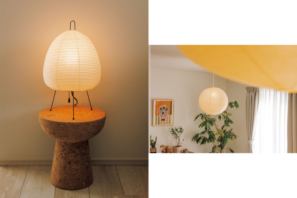 和紙を通した光が温かく灯る、彫刻家のイサム・ノグチが手掛けた照明「AKARI」シリーズ。スタンドは佐藤さんが独身時代に購入したもの。その後、リビングとダイニングにペンダントライトが加わった。