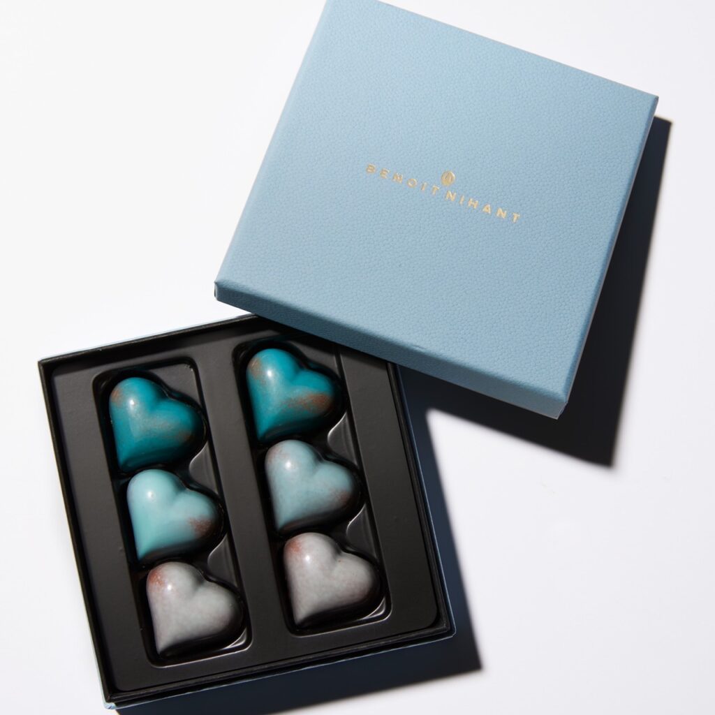 「毎年人気を集めているハート型のボンボンアソート『ブルーデトワ』は、ベルギーで“あなたに夢中”という意味を持つのだそう。青を基調としたグラデーションデザインはまるで宝石のように美しく、視覚的にも満足できる一品に仕上げられています」(中川さん)