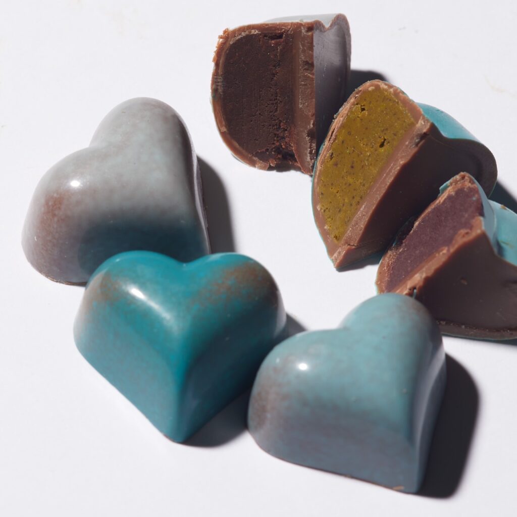 「外側はパリッとした厚めのコーティングチョコレート、中はなめらかな舌触りのガナッシュがぎっしり詰まっていて、食感のコントラストを楽しめるのが魅力。今年は、ザクザクとしたピスタチオをアクセントに効かせた『ブルーデトワ ピスタチオ」が新作として仲間入りしました」(桶谷さん)