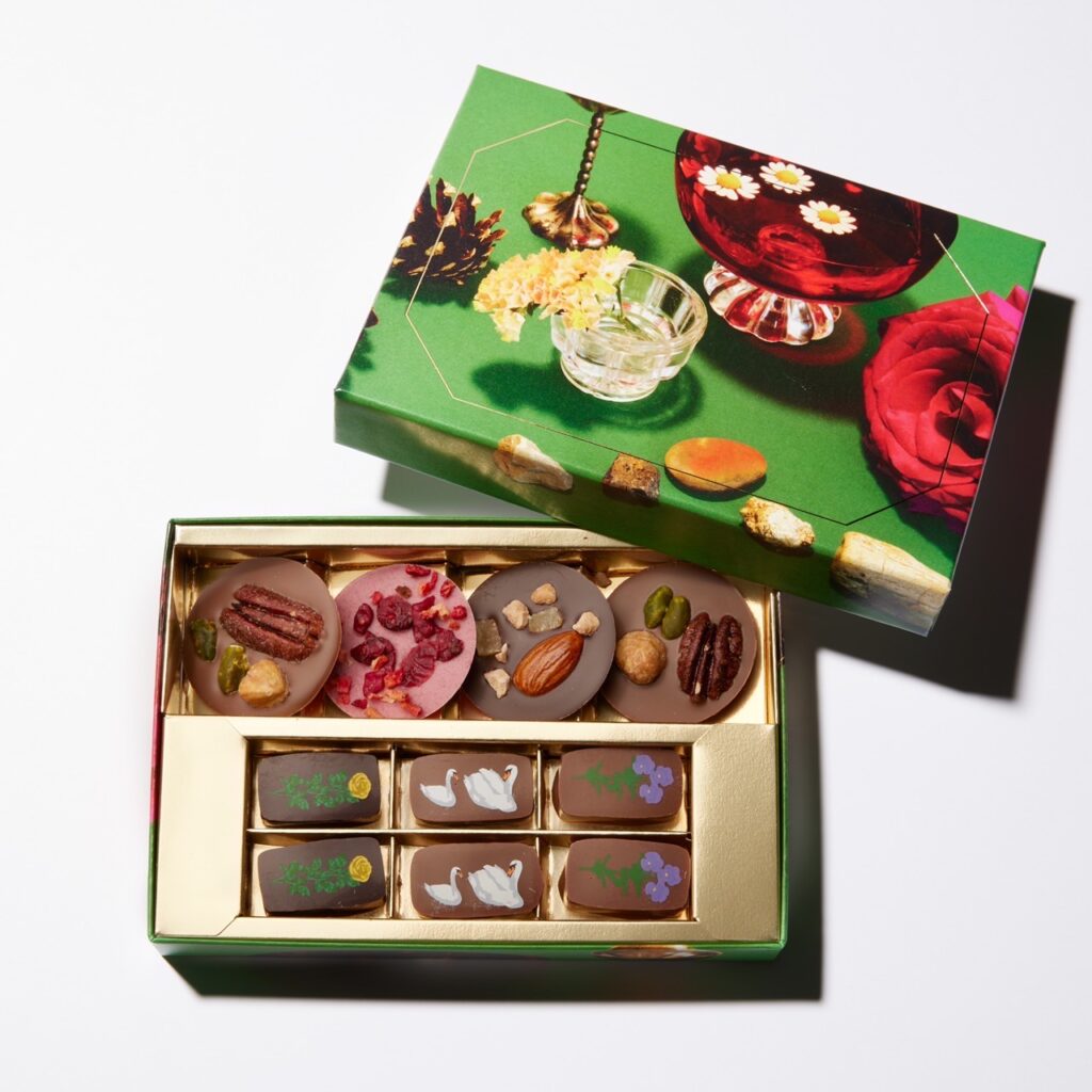 「バレンタインデーを日本に広めたとされるスイーツブランド『メリー』から2017年に立ち上げられた『ルル メリー』。草花や木々をモチーフにしたちょっぴりレトロなパッケージが注目を集め、瞬く間に人気店となりました。2024年のバレンタインは“湖畔でみつけた、小さな宝物”をテーマに、白鳥がプリントされたガナッシュや、ナッツやドライフルーツが散りばめられたマンディアンチョコレートが詰め合わされています。ほんのりお酒が効いたフレーバーもあり、大人が楽しめる味わいです」(桶谷さん)