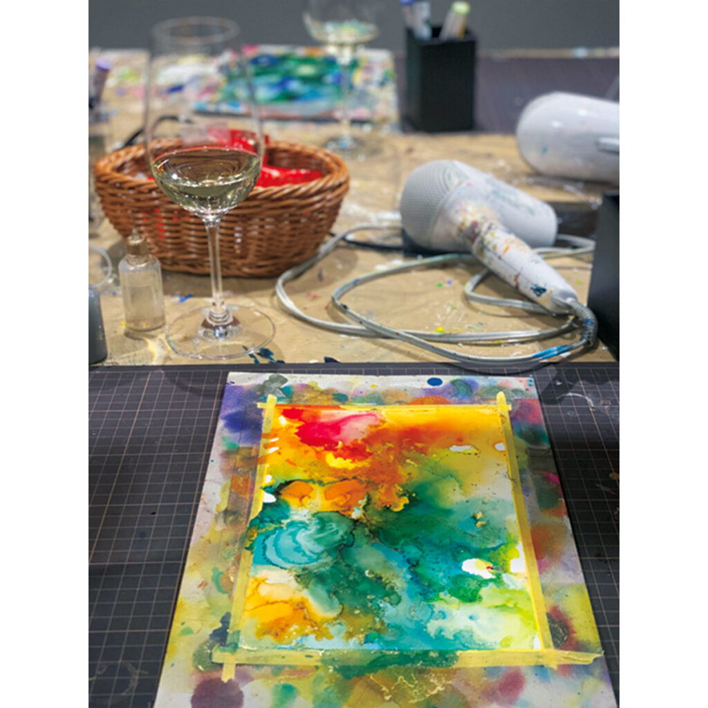 画家の軌跡や絵画のテーマとペアリングしたワインをいただきながら絵を完成させます