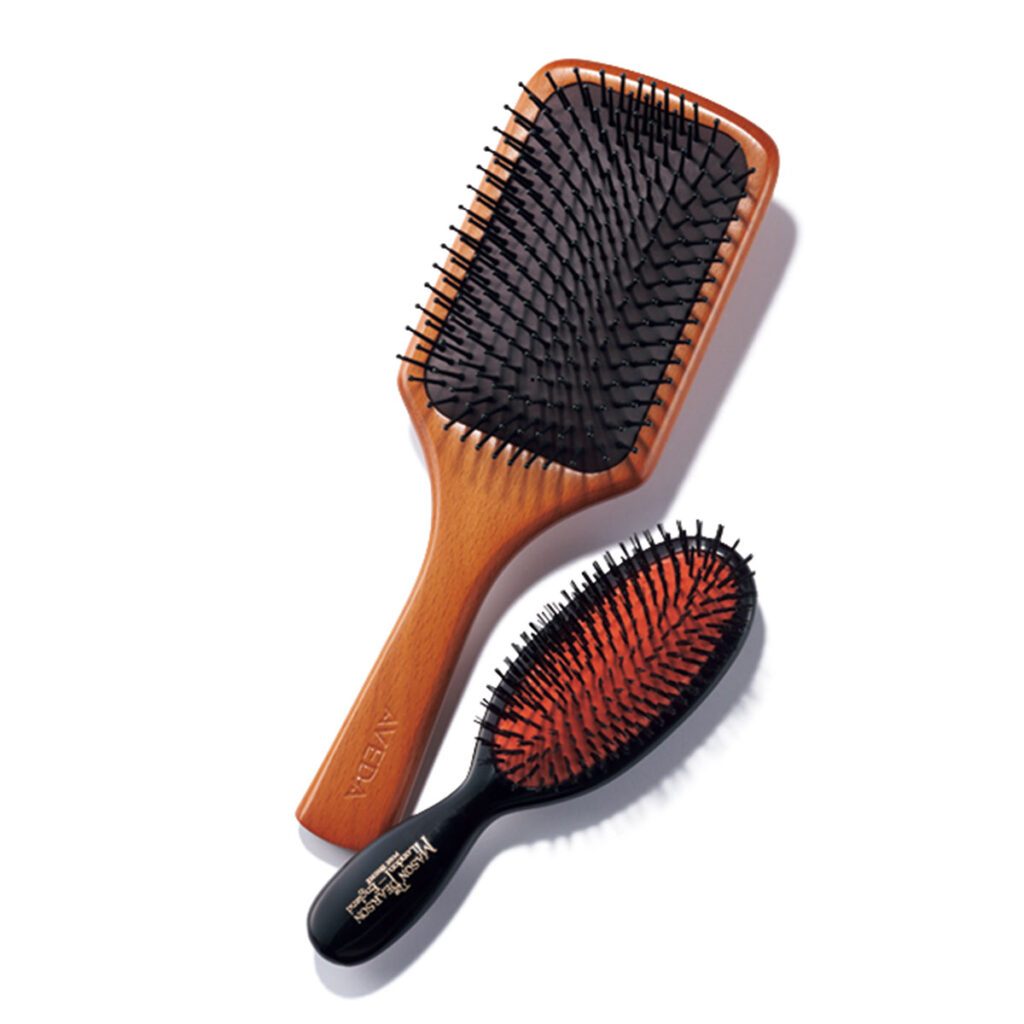 「メイソンピアソンは10年選手。髪がキレイな人はみんな使ってると思う。アヴェダのブラシは名入れができるから、ギフトにすることも多いの。」上_適度な刺激が心地いい、スカルプケアにおすすめのアイテム。パドルブラシ¥5,060(アヴェダ)下_プロのヘアスタイリストやセレブリティが愛用する最高峰ブラシ。硬さやサイズで自分にぴったりの一本が見つかります。大事に使えば一生モノに。ブラシ「ポケットブリッスル」¥17,600(メイソンピアソン/オズ・インターナショナル)