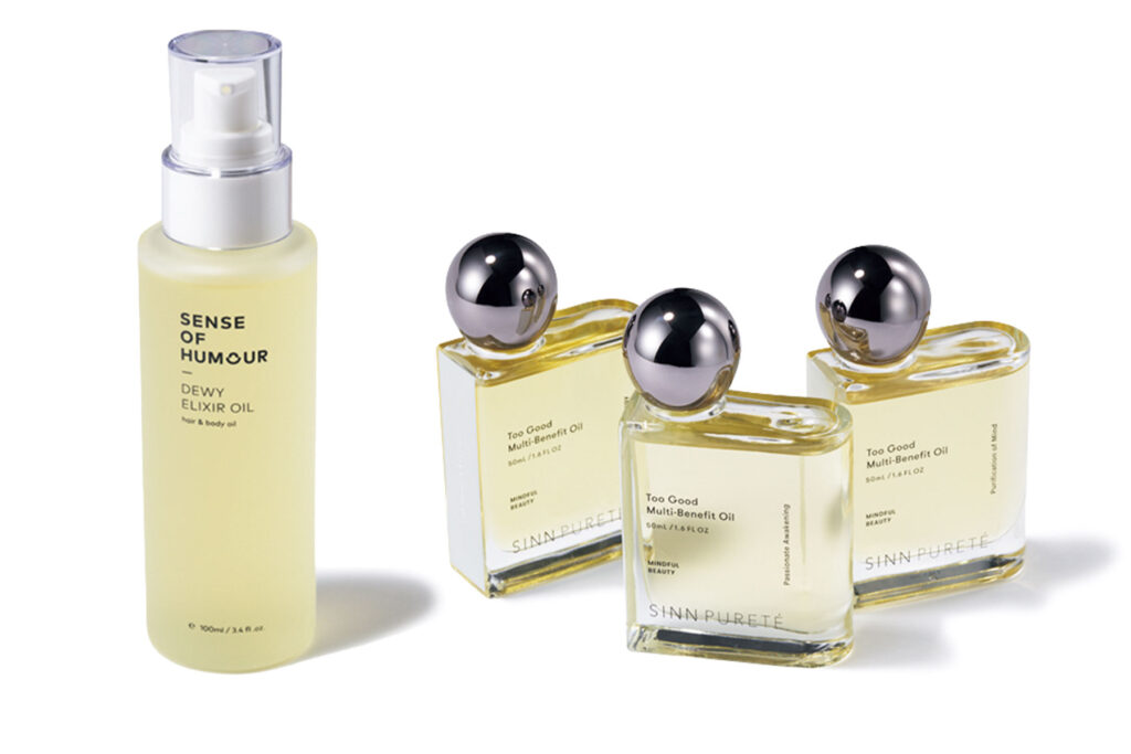 「オイルでケアするのが好きで、愛用しているのがこちら。テクスチャーだけでなく香りも譲れない!仕上げに毛先になじませてニュアンスをつけたりすることも。」左_しっとり潤い、髪の毛のまとまりがアップ。「なくなると落ち着かなくなるほど頼りにしてる♡」。デューイエリクシアオイル 100㎖¥8,800(SENSE OF HUMOUR)右_アウトバス、スタイリング剤、ボディやハンドに…その名のとおりマルチに活躍。「持続力の高い香りは3種ともお気に入り。ボトルデザインもモダンでインテリアにマッチしてくれるのもいい!」トゥーグッドマルチベネフィットオイル 50㎖各¥3,850(シンピュルテ)
