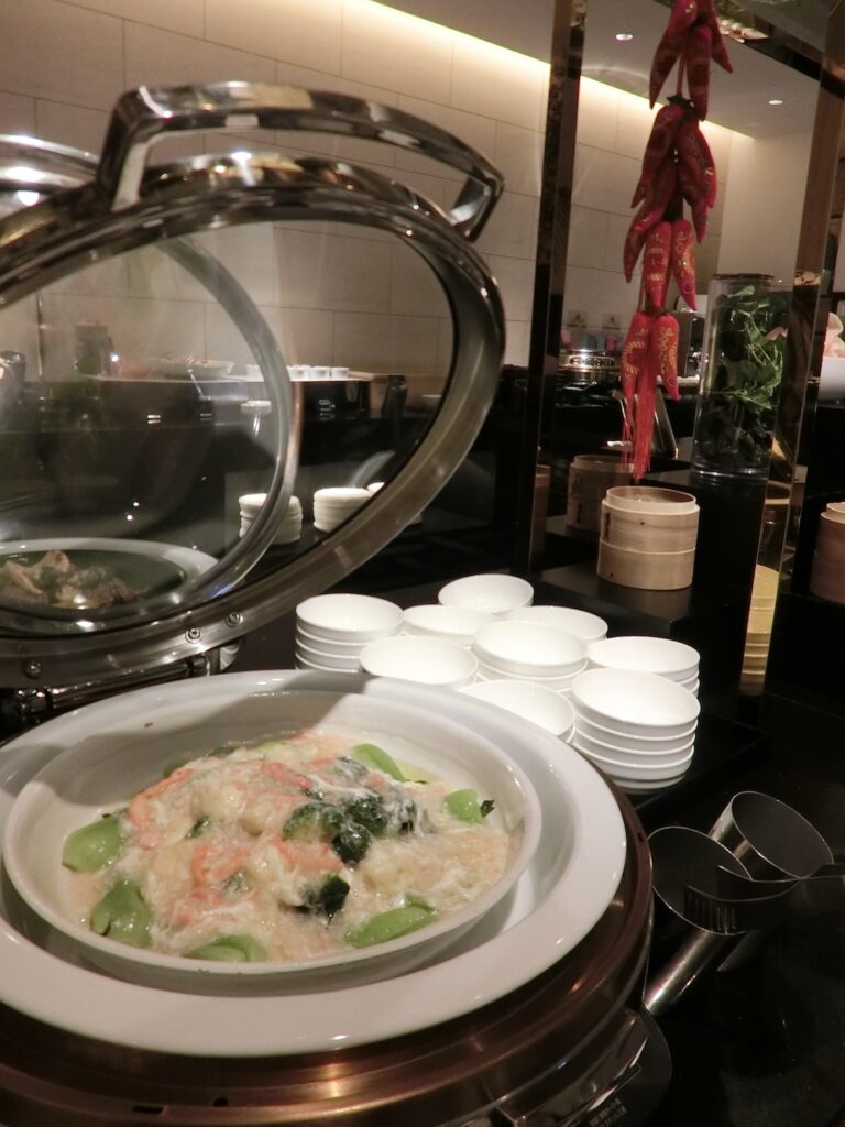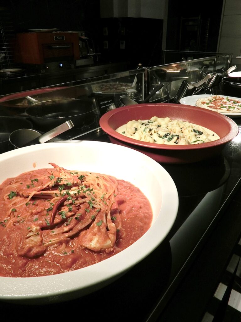 時間帯変わって、夜はディナービュッフェへGO! 本格中華をビュッフェスタイルで楽しむことができるのもヒルトン横浜のおすすめポイント。横浜市場から仕入れた新鮮な魚介類を使ったアクアパッツアに自分で作るちらし丼、自家製ローストビーフに生パスタなど、目が離せない世界各国の料理が盛りだくさん。宿泊したタイミングは旧正月期間ということもあり、春節の雰囲気を感じられる装飾も。ライブキッチンでの海鮮鉄板焼きもお見逃しなく!