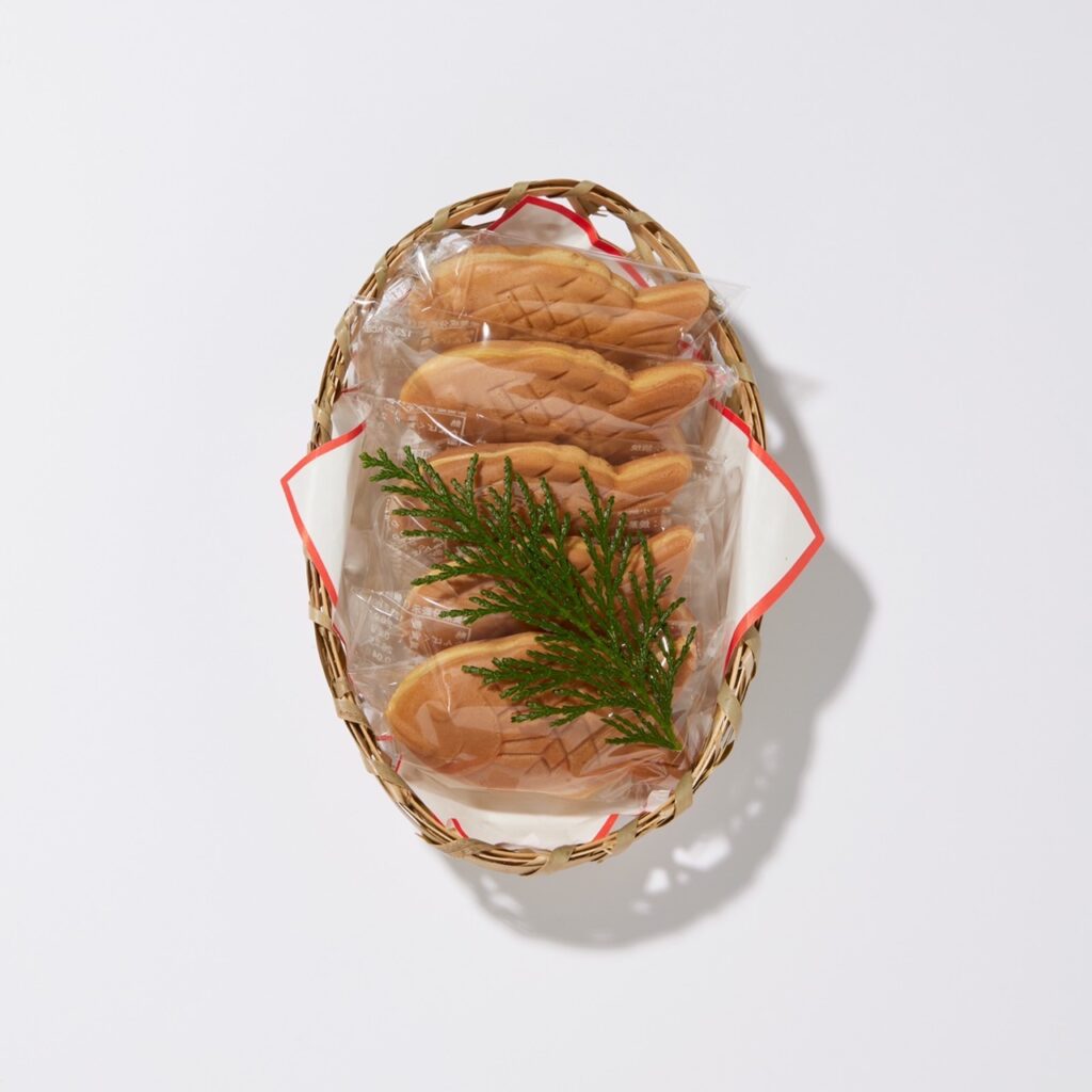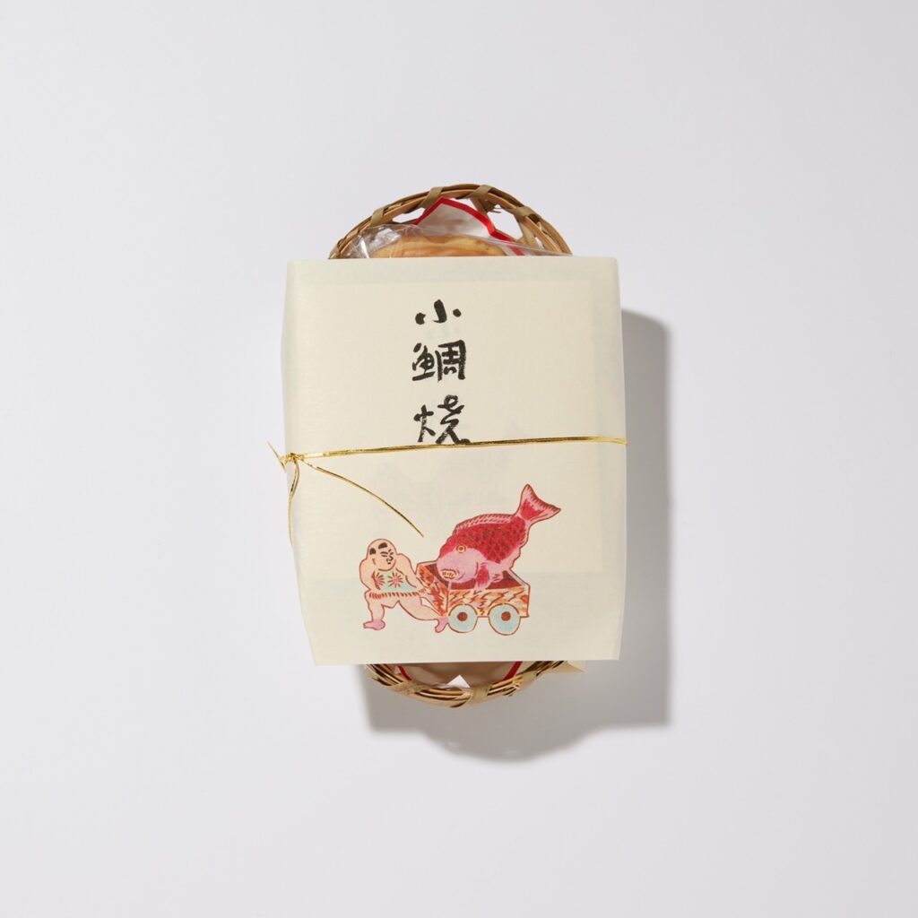 「笹の葉を彷彿とさせる包み紙を取ると、高級感のある竹篭に詰められた小鯛焼が。『鯛車』をひく童子のおめでたい掛け紙や、小鯛焼に添えられた檜葉も目を引きます」(児嶋さん)