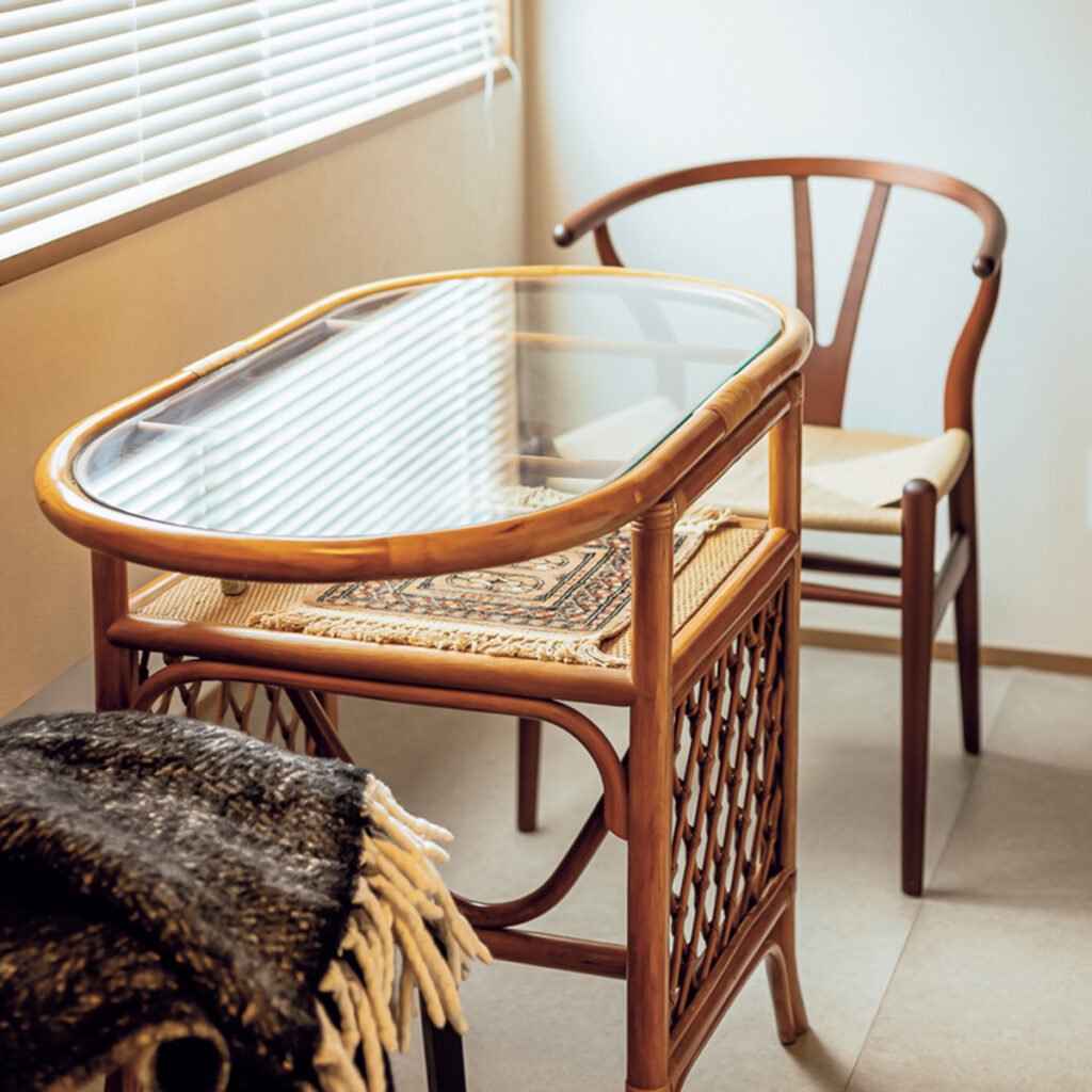 ハンス J. ウェグナーデザインのYチェアは、金本さんが30歳の誕生日を迎えた記念に購入したもの。「マホガニー材を選んだのもこだわりの一つ。とても思い入れがあるアイテムです」。ガラストップが抜け感を与えてくれるテーブルはアンティーク。
