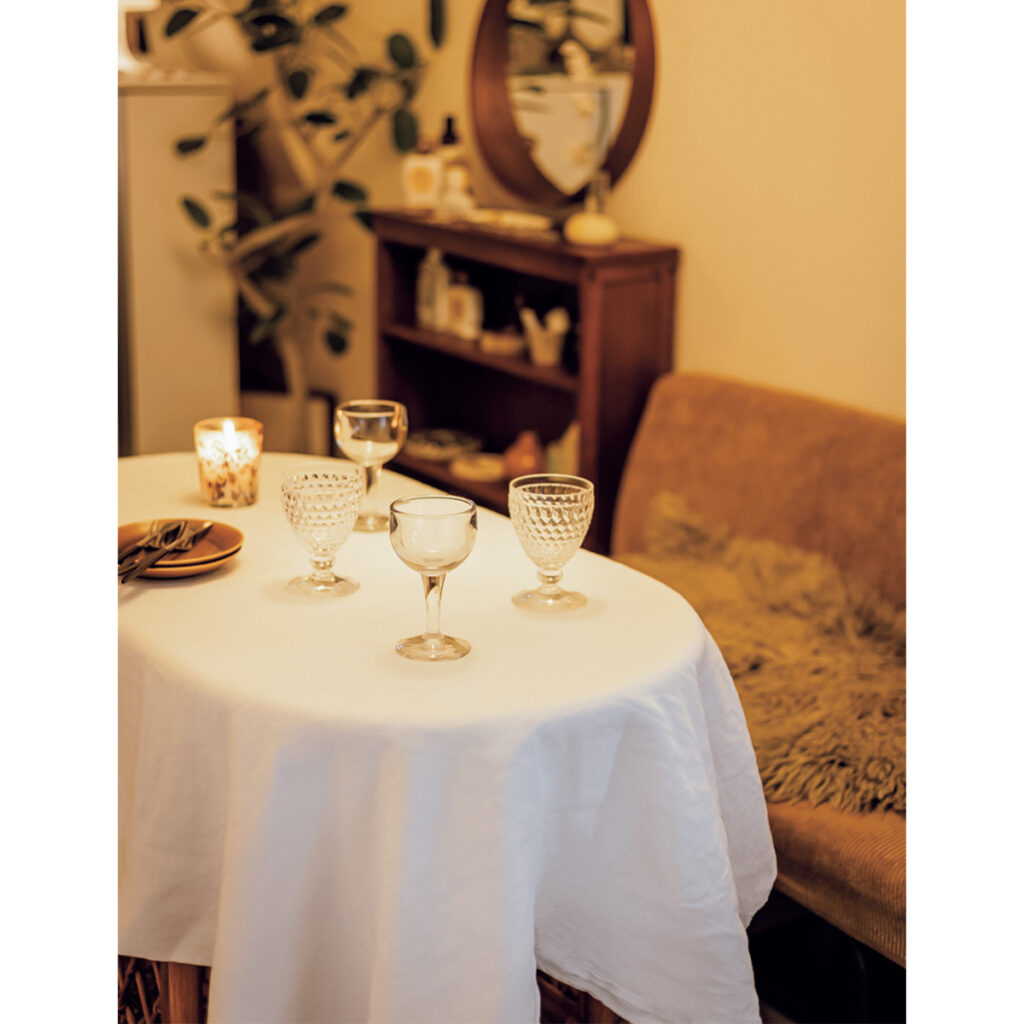 目下のお楽しみは「これまでは手狭なワンルームだったから叶わなくて」と語る、友人を招いてのホームパーティー!普段使いのテーブルをレストラン気分にしてくれる簡単アレンジは是非とも真似してみたいもの。