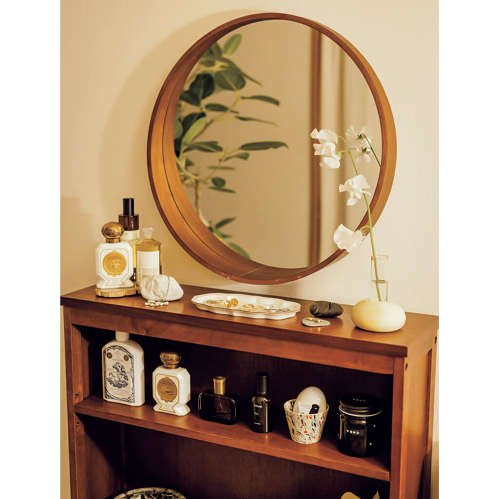鏡と棚を組合せたドレッサー。上の段から、よく身に着けるアクセサリーを入れたトレイと香水を置いて。