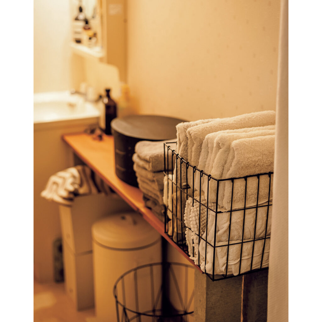洗面スペースにはブロックを重ねて天板を渡した自作の棚を。化粧品は黒のシェーカーボックスに、タオル類はワイヤーバスケットに収納している。