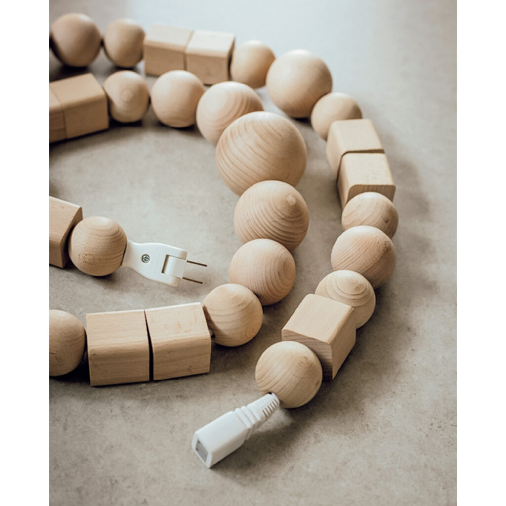 ケーブルがウッドパーツで隠された延長コードは、ファッション・プロダクトブランドBLESSの「ケーブルジュエリー」。