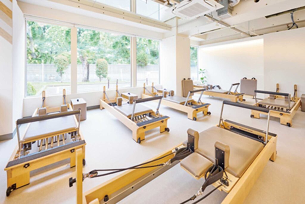全スタジオの天井に鏡を完備し、レッスン中に動きを確認できる。グループ:月額プラン¥11,000/月、チケットプラン¥2,750/回、プライベート:¥4,400~、体験¥2,200 https://www.konami.com/sportsclub/pilatesmirror/
