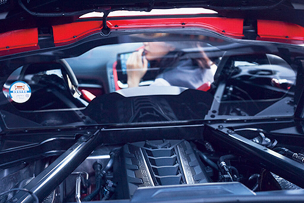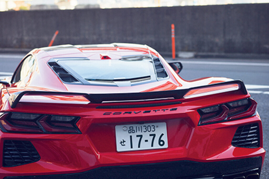 コルベットを知る人は、頭文字と数字を組合せた愛称で呼ぶのだとか。1953年のデビューから数えて8代目となる現行モデルなら「C8」。C8で初めて採用したミッドエンジンによって、さらにダイナミックなスポーツカーへと生まれ変わったそう。マニアックな話はさておき、私たちにとっては目の前に佇むスーパースタイリッシュなフォルムこそが正義。一瞬、たじろいでしまいそうなほどの迫力。だけど、撮影を終えたとき紘菜さんが口にした「すっごく気分が高揚した!」が言い得て妙。たとえば一日の終わり、シートに身を委ね夜の街をぐるりと一周。いいこともイヤなことも、引っくるめて最高の終わりへと昇華させてくれるはず。移動手段としてだけではなく、日々の上げスイッチとなるまさに最高の一台。