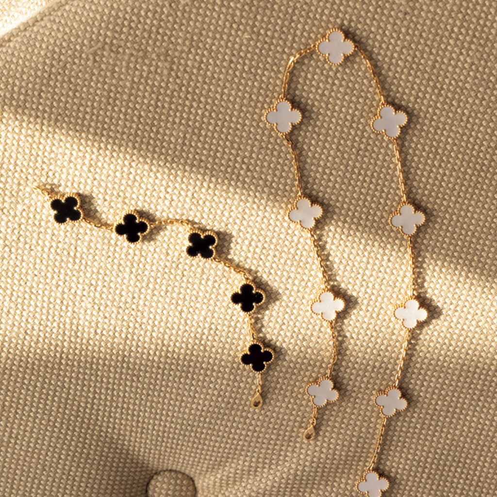 子どもが男の子で家庭に女性が私だけという環境だからかな、可愛いものが前より好きになって、ジュエリーは完全に甘モード。子育て真っ只中のため、服はカジュアルが大前提なので、ジュエリーだけでも甘さが欲しいという深層心理かもしれません。ブレスレットは日常使いしやすいオニキス、ネックレスは母的ニーズを見据えて、パール代わりにも使えそうなMOPを選択。