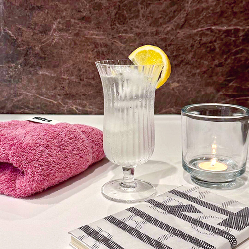 ゆっくり湯船につかれる夜は、レモンをたっぷり搾り入れた炭酸水がおとも。心身ともにリラックスできるのはもちろん、血行がより良くなることで、翌朝のむくみ防止にも。