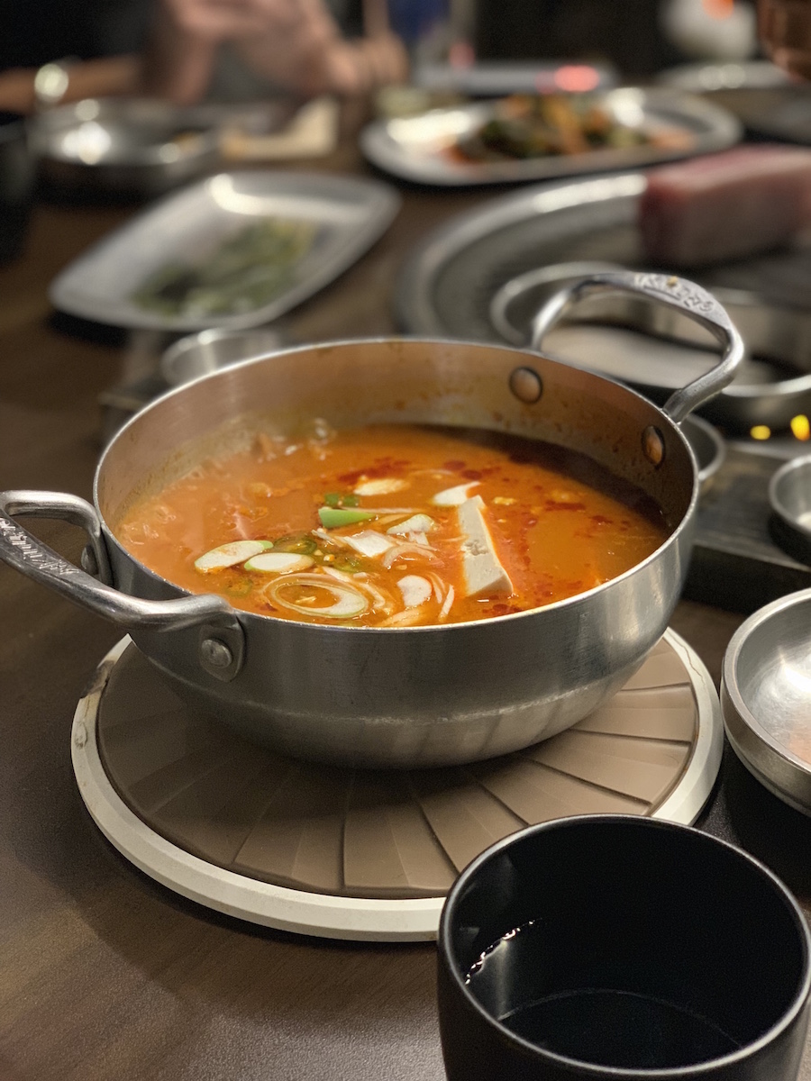 テーブルの上で温めながらいただくキムチチゲは、コクがあり程よい酸味が効いていて美味しい!