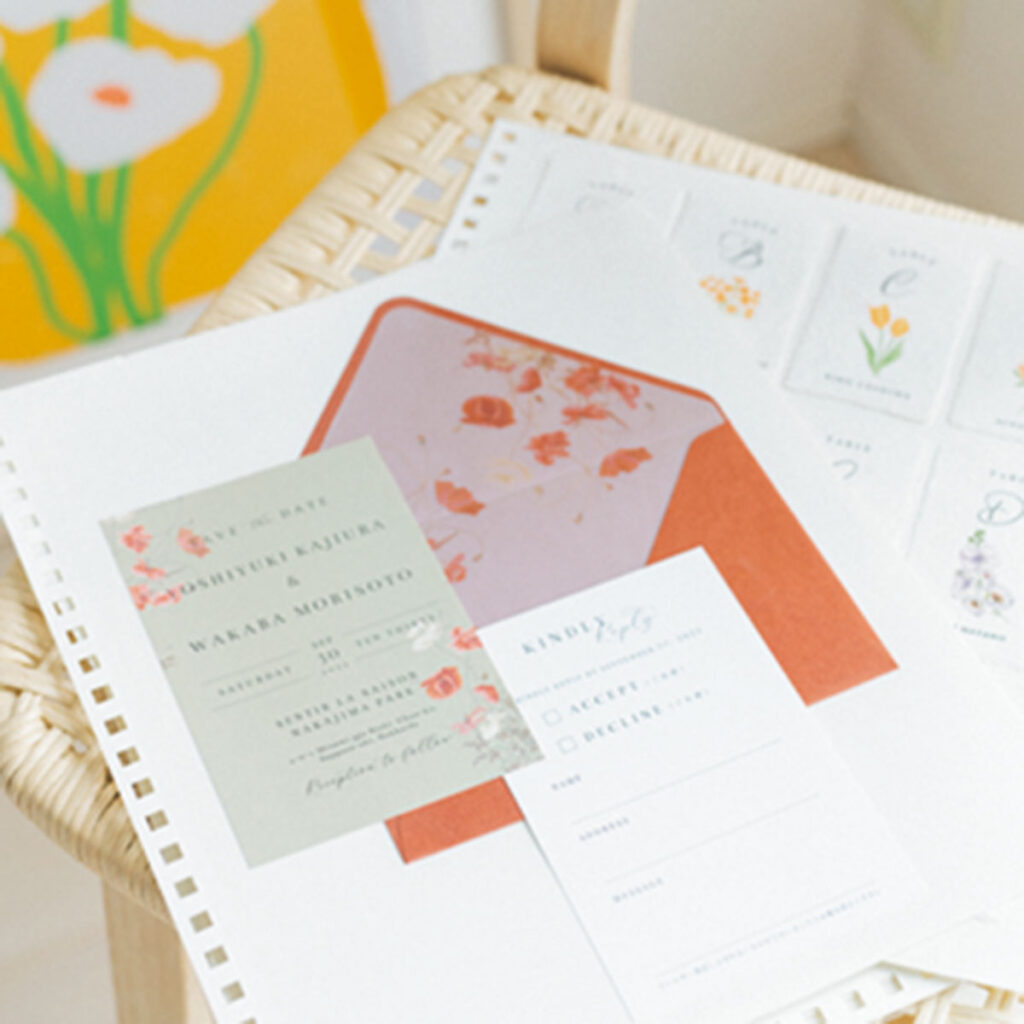 新卒は不動産営業として働いていたものの合わないと感じ、隙間時間で趣味のイラストをココナラで販売し始めたのがきっかけ。当時は売れたらラッキーくらいの気持ちでしたが、売り上げが伸びていくうちに事業を拡大したくなり、グラフィックデザインに移行。ウェディングペーパーアイテムの製作を始めた頃は右も左も分からない状態でしたが、モニター募集して手を動かし、独学でデザインとマーケティングを学びました。同時に、他のペーパーアイテムから何が素敵で何がイマイチかを分析して感覚を磨き、自分のデザインを確立。今は〝カラフル×上品〟をコンセプトに、紙質にもこだわって製作しています。