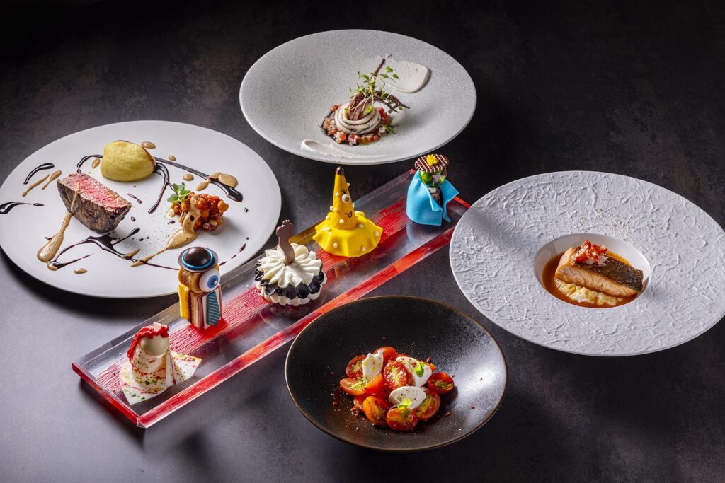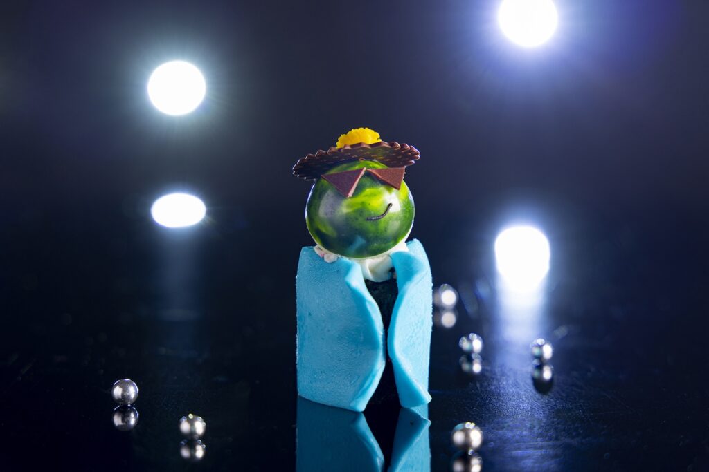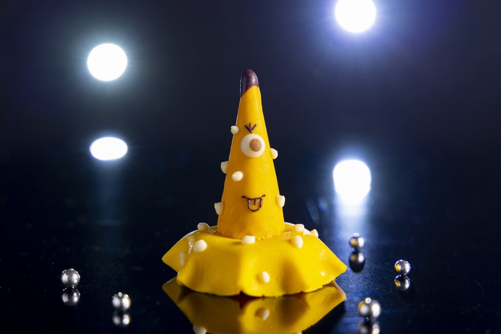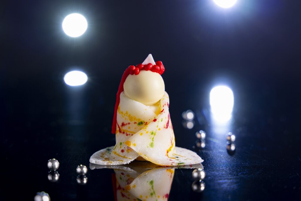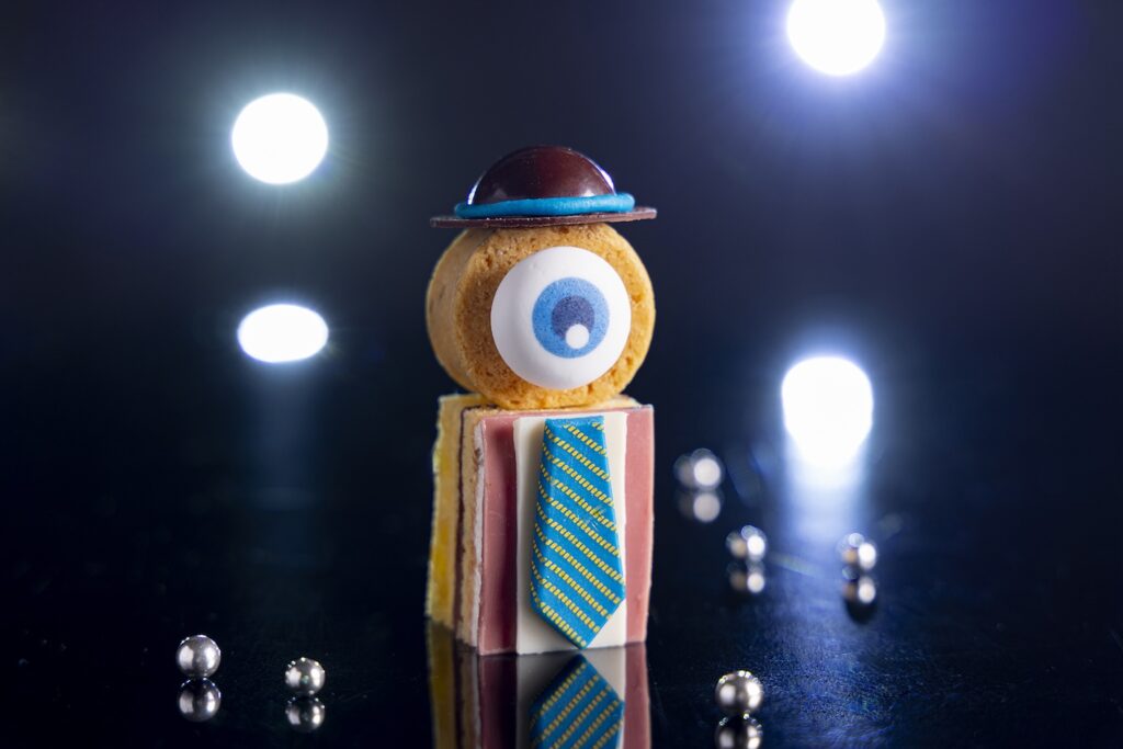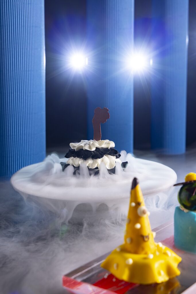 ランウェイに見立てたプレートに立ち並ぶのは秋の味覚がふんだんに感じられる妖怪スイーツたち! 旬の栗やさつまいも、洋梨にぶどうなどを使用したスイーツは、個性的な見た目とは裏腹に、優しく上品な味わいです。プレミアムプランでのみ提供されるモンブランは、カシスとの相性がベストマッチな1品で、いったんもめんがはらりと舞い下りてきたような楽しいビジュアルに。さらに、ろくろ首がステージに立つクイーンのようにスモークの演出で登場するのも見逃せないポイント!