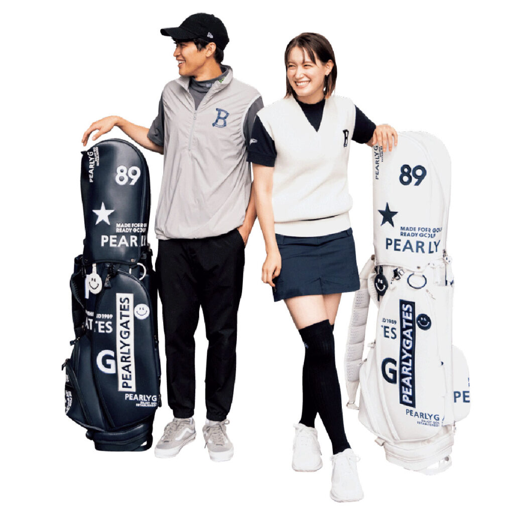 〈男性〉¥19,800パンツ¥26,400カットソー¥15,400ベ スト(ともにビームス ゴルフ/ビームス ゴルフ 有楽町)キャップ¥4,400(ニューエラ)シューズ¥12,100(ヴァンズ ヴォルト/ハンドイントゥリー)キャディーバッグ¥70,400(パーリーゲイツ/TSI)