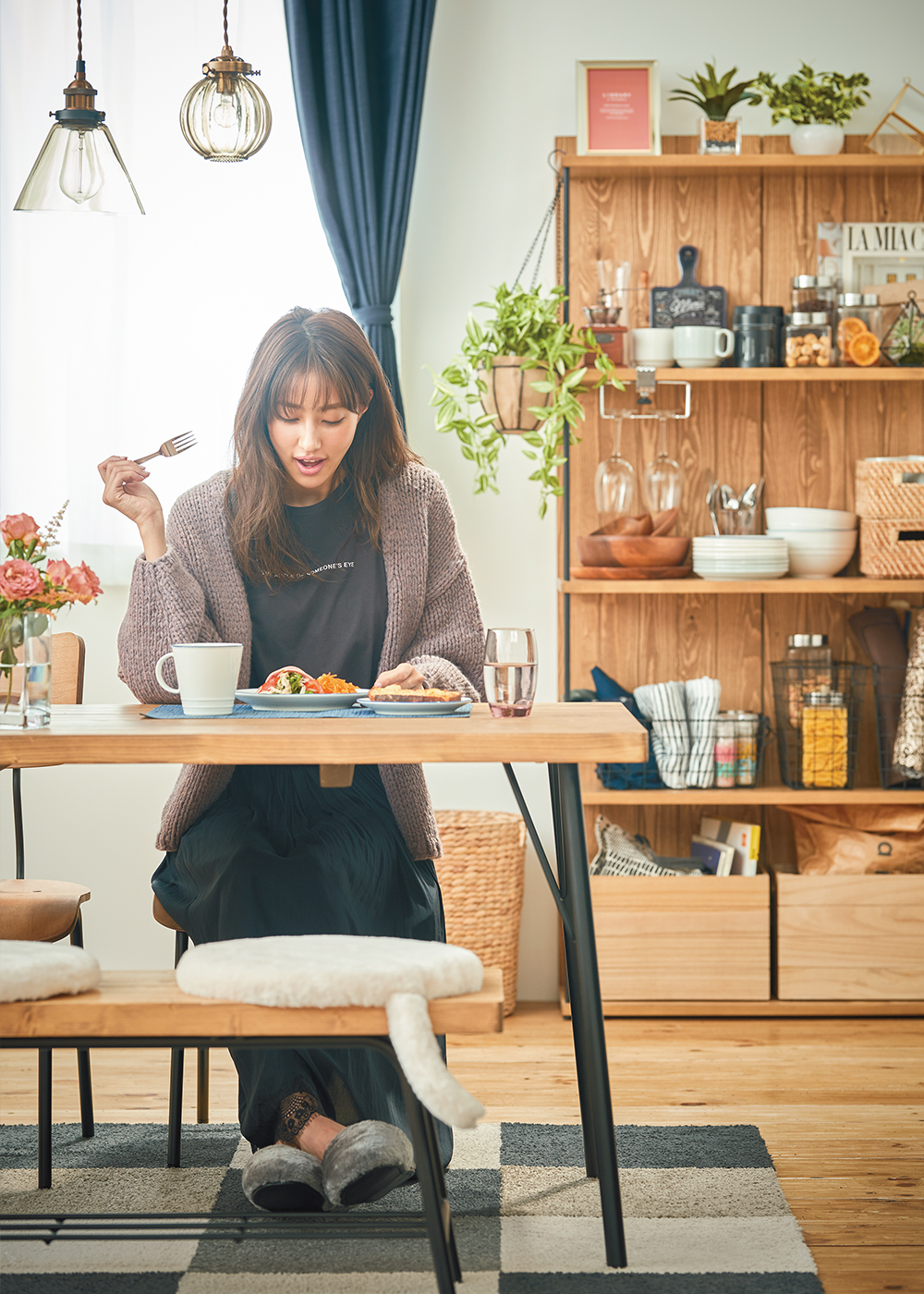 ダイニングテーブル¥26,111 ダイニングチェア各¥11,019 ベンチ¥16,574 チェアパッド各¥1,355[ テーブルの上] カトラリー〈8点セット〉¥648ランチョンマット¥277 マグ¥277 プレート〈16cm〉¥185〈21cm〉¥277 タンブラー〈2個セット〉¥185 フラワーベース¥740 タイルカーペット各色¥370 ペンダントライト各種¥3,695※電球別売り カーテン〈100×135cm×2枚セット〉¥3,695 レースカーテン〈100×133cm×2枚セット〉¥2,769 床に置いたバスケット¥1,843 シェルフ¥27,686 シェルフに吊るしたフェイクグリーン¥2,769【 シェルフの上段左から】 フォトフレーム〈2L判〉¥370 フェイクグリーン各種¥925【 シェルフの2段目左から】 カラフェ¥277 コーヒーミル¥925 トリベット¥277 マグ各色¥185 ガラスキャニスター〈350mL〉¥277〈600mL〉¥370【 シェルフの3段目左から】 ワイングラスハンガー¥925 ワイングラス〈2脚セット〉¥555 アカシアプレート〈スクエア10cm〉¥185〈ラウンド18cm〉¥462〈ラウンド25cm〉¥925 アカシアボウル〈14cm〉¥370〈19cm〉¥925〈23cm〉¥1,380 カトラリー各種¥370 プレート各色¥277 サラダボウル各¥555【 シェルフの4段目左から】 ワイヤーバスケット各種¥925 バスケットに入れたフェイスタオル各¥370【 シェルフ下段】木製バスケット各¥1,380(すべてニトリ) その他スタイリスト私物