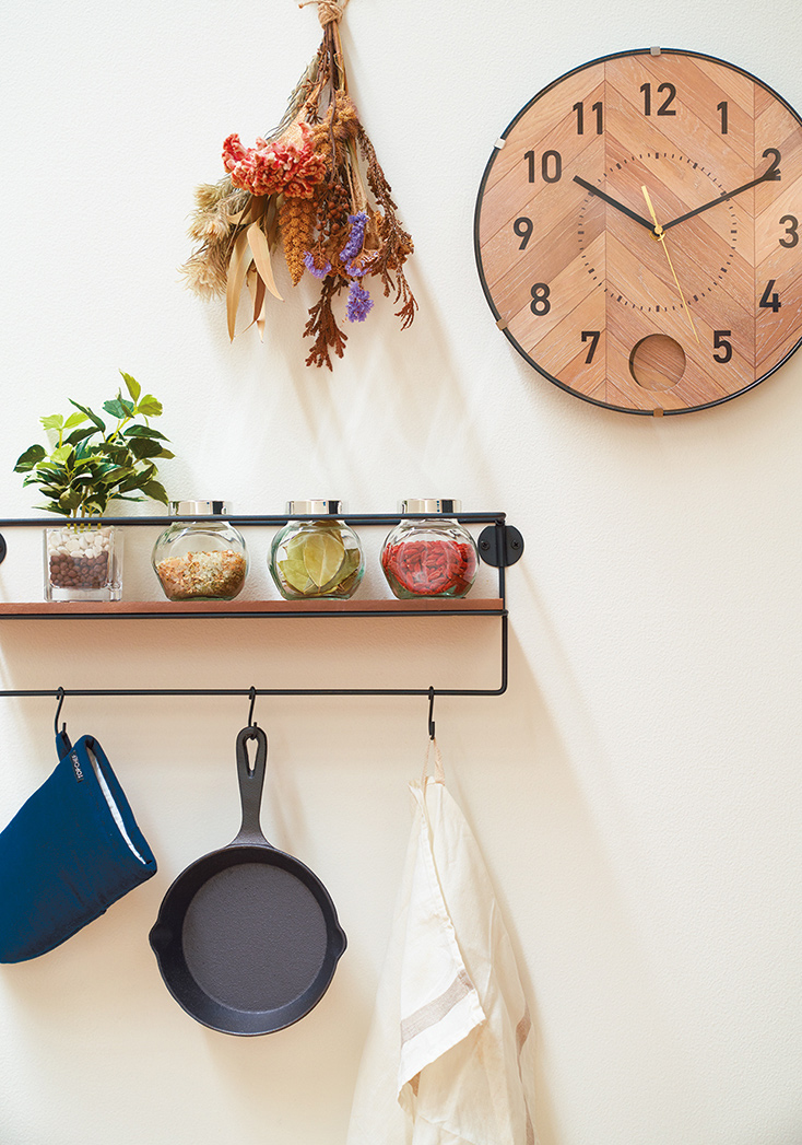 掛け時計¥1,843※電池・壁用フック別売り ウォールシェルフ¥1,195 フェイクグリーン¥571 スパイスジャー〈4個セット〉¥166 ミトン¥370 スキレット鍋¥462(すべてニトリ) その他スタイリスト私物
