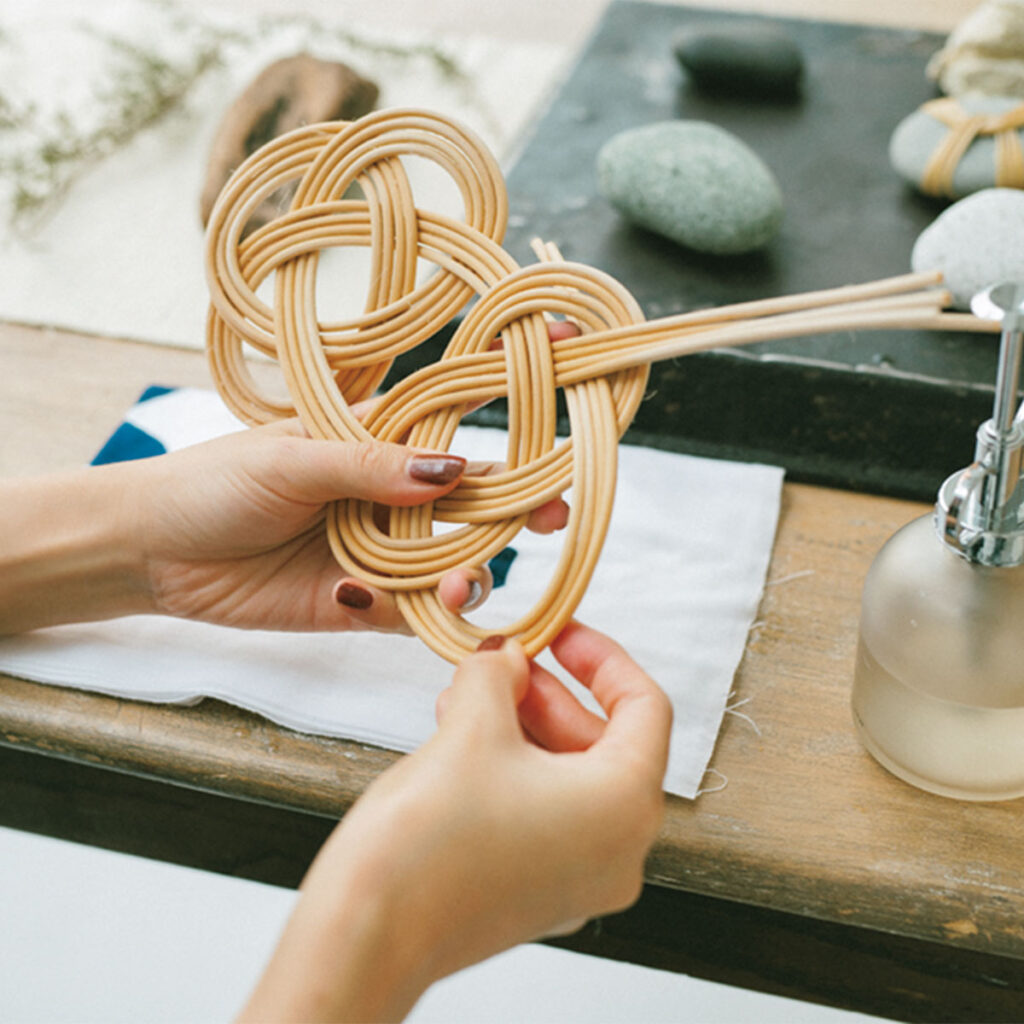 才能を発揮した美月ちゃん、続いて4本の籐を使ったアートに挑戦。壁に掛けるタペストリーを教えてもらいます。