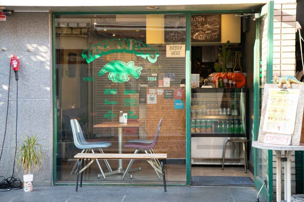 タコスブーム到来前の2006年にオープン。15種類のラインナップを誇るタコスは、生地はソフト、クリスピーコーン、フライドから、ソースは4種類から選べるのも◎。左¥734、右¥464