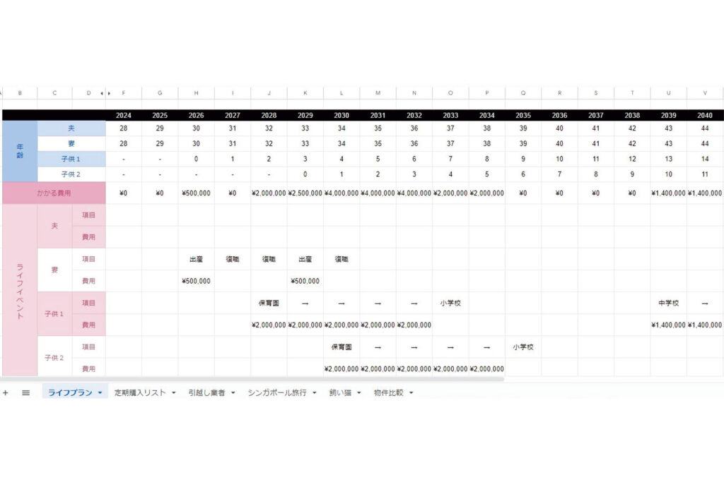 西暦と年齢の下に、その年に起こりうるライフイベントとおおまかな費用を入力。客観的な指標があることで理想と現実のギャップや夫婦間の認識のズレが明確になり、スムーズに話し合いができるようになりました。