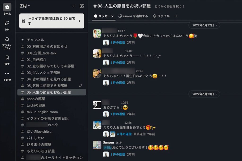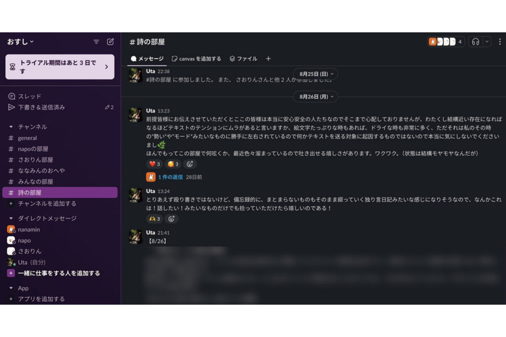 Slackを使い始めて、友人との繋がりがアップデートされました。最大の魅力は、メッセージを見る側も送る側もストレスフリーなこと。年齢を重ねると人生のフェーズもそれぞれ変わってきて、話題や連絡のタイミングに気を遣いますが、スレッドごとに同じ温度感を持つ人同士で交流できるので、相手の反応がないことを気にしたり、大した話題じゃないからとメッセージを送ることを躊躇したりすることがありません。社会人になって友人たちと頻繁に集まることが難しくなりましたが、Slackがあればお互いの考えや気持ちを共有し合えて相手を近くに感じることができます。私にとって欠かせないコミュニケーションツールです。