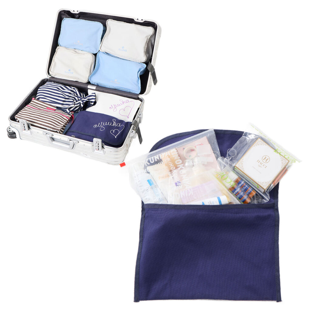 「コスメやサプリはファスナーつき袋で一目瞭然に収納。二重にして徹底的に液漏れ防止!」