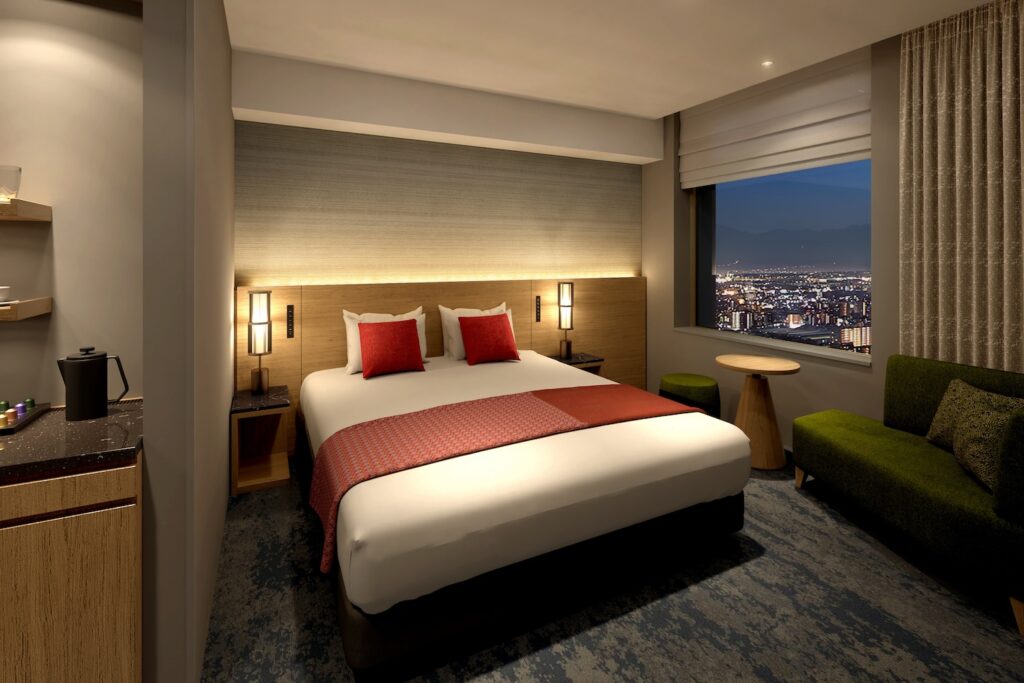 ホテルの所在地は、大阪城公園と難波宮跡公園の間。客室は221室あり、どの客室からも大阪城公園や難波宮跡公園を望むことができます。また、すべての客室が50平方メートル以上あり、大阪でも最大級の広さを誇ります。さらに、ウェルビーイングをコンセプトの一つとするパティーナならではの特徴として、全客室にヨガマットを用意。各フロアの角部屋は、都市型のホテルには珍しい広々としたバルコニーも付いています。日本の季節を慈しむことのできる空間設計や、和の趣を感じられる落ち着きのあるデザインで、ここでしか味わえない大阪の歴史と自然を味わう滞在を楽しんで。